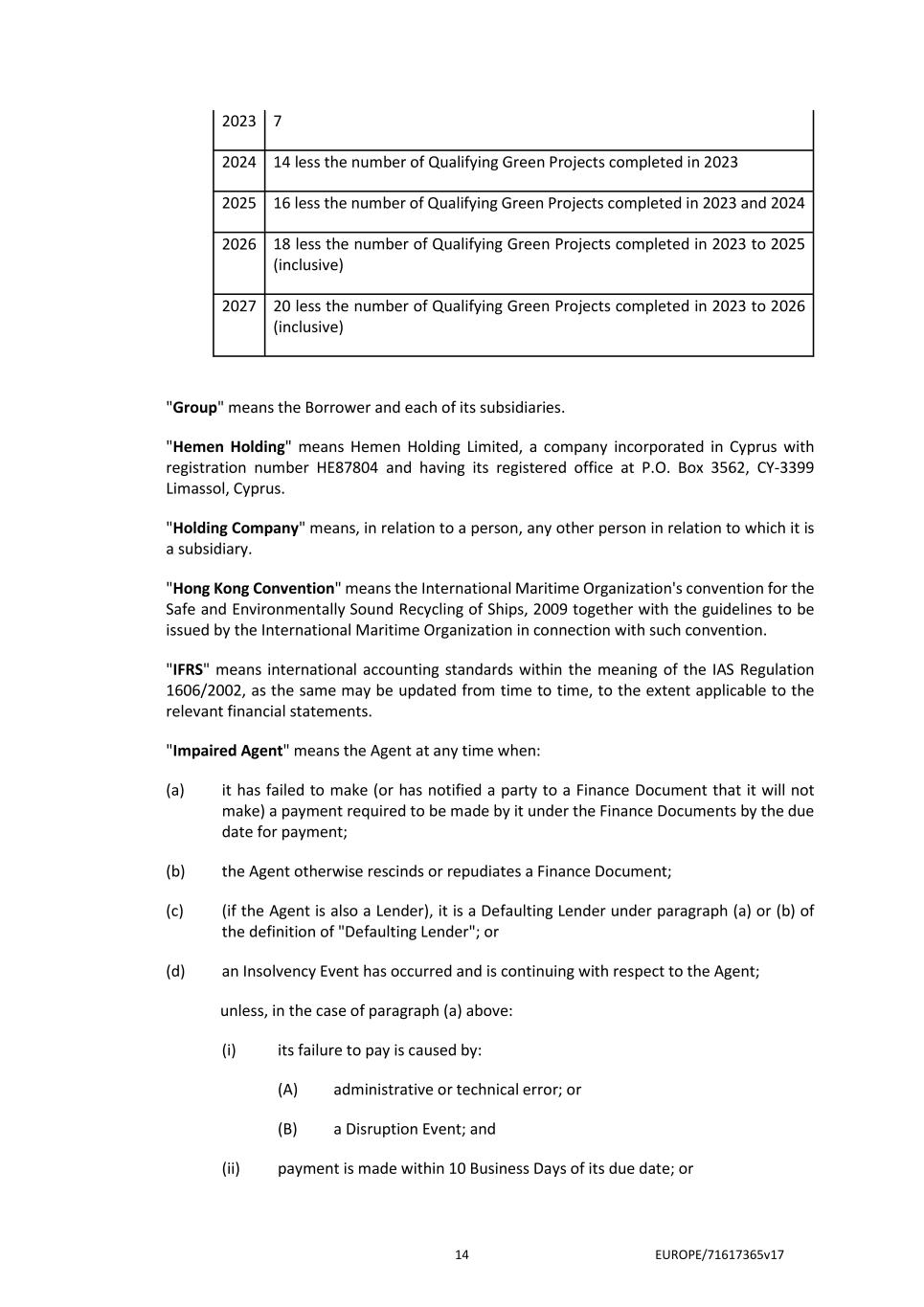 14 EUROPE/71617365v17 2023 7 2024 14 less the number of Qualifying Green Projects completed in 2023 2025 16 less the number of Qualifying Green Projects completed in 2023 and 2024 2026 18 less the number of Qualifying Green Projects completed in 2023 to 2025 (inclusive) 2027 20 less the number of Qualifying Green Projects completed in 2023 to 2026 (inclusive) "Group" means the Borrower and each of its subsidiaries. "Hemen Holding" means Hemen Holding Limited, a company incorporated in Cyprus with registration number HE87804 and having its registered office at P.O. Box 3562, CY-3399 Limassol, Cyprus. "Holding Company" means, in relation to a person, any other person in relation to which it is a subsidiary. "Hong Kong Convention" means the International Maritime Organization's convention for the Safe and Environmentally Sound Recycling of Ships, 2009 together with the guidelines to be issued by the International Maritime Organization in connection with such convention. "IFRS" means international accounting standards within the meaning of the IAS Regulation 1606/2002, as the same may be updated from time to time, to the extent applicable to the relevant financial statements. "Impaired Agent" means the Agent at any time when: (a) it has failed to make (or has notified a party to a Finance Document that it will not make) a payment required to be made by it under the Finance Documents by the due date for payment; (b) the Agent otherwise rescinds or repudiates a Finance Document; (c) (if the Agent is also a Lender), it is a Defaulting Lender under paragraph (a) or (b) of the definition of "Defaulting Lender"; or (d) an Insolvency Event has occurred and is continuing with respect to the Agent; unless, in the case of paragraph (a) above: (i) its failure to pay is caused by: (A) administrative or technical error; or (B) a Disruption Event; and (ii) payment is made within 10 Business Days of its due date; or