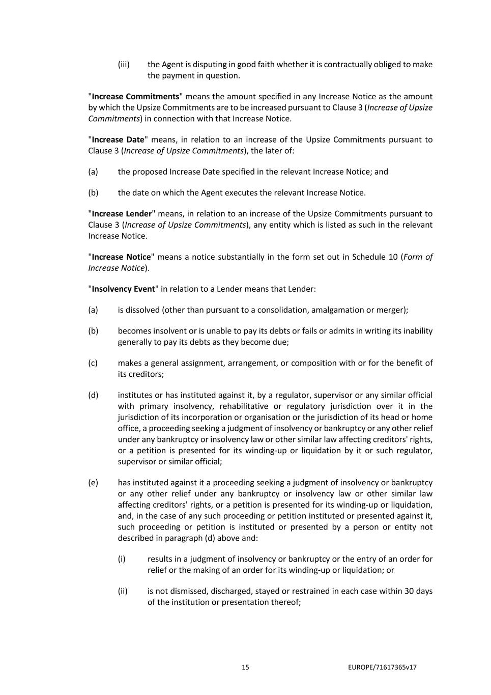 15 EUROPE/71617365v17 (iii) the Agent is disputing in good faith whether it is contractually obliged to make the payment in question. "Increase Commitments" means the amount specified in any Increase Notice as the amount by which the Upsize Commitments are to be increased pursuant to Clause 3 (Increase of Upsize Commitments) in connection with that Increase Notice. "Increase Date" means, in relation to an increase of the Upsize Commitments pursuant to Clause 3 (Increase of Upsize Commitments), the later of: (a) the proposed Increase Date specified in the relevant Increase Notice; and (b) the date on which the Agent executes the relevant Increase Notice. "Increase Lender" means, in relation to an increase of the Upsize Commitments pursuant to Clause 3 (Increase of Upsize Commitments), any entity which is listed as such in the relevant Increase Notice. "Increase Notice" means a notice substantially in the form set out in Schedule 10 (Form of Increase Notice). "Insolvency Event" in relation to a Lender means that Lender: (a) is dissolved (other than pursuant to a consolidation, amalgamation or merger); (b) becomes insolvent or is unable to pay its debts or fails or admits in writing its inability generally to pay its debts as they become due; (c) makes a general assignment, arrangement, or composition with or for the benefit of its creditors; (d) institutes or has instituted against it, by a regulator, supervisor or any similar official with primary insolvency, rehabilitative or regulatory jurisdiction over it in the jurisdiction of its incorporation or organisation or the jurisdiction of its head or home office, a proceeding seeking a judgment of insolvency or bankruptcy or any other relief under any bankruptcy or insolvency law or other similar law affecting creditors' rights, or a petition is presented for its winding-up or liquidation by it or such regulator, supervisor or similar official; (e) has instituted against it a proceeding seeking a judgment of insolvency or bankruptcy or any other relief under any bankruptcy or insolvency law or other similar law affecting creditors' rights, or a petition is presented for its winding-up or liquidation, and, in the case of any such proceeding or petition instituted or presented against it, such proceeding or petition is instituted or presented by a person or entity not described in paragraph (d) above and: (i) results in a judgment of insolvency or bankruptcy or the entry of an order for relief or the making of an order for its winding-up or liquidation; or (ii) is not dismissed, discharged, stayed or restrained in each case within 30 days of the institution or presentation thereof;