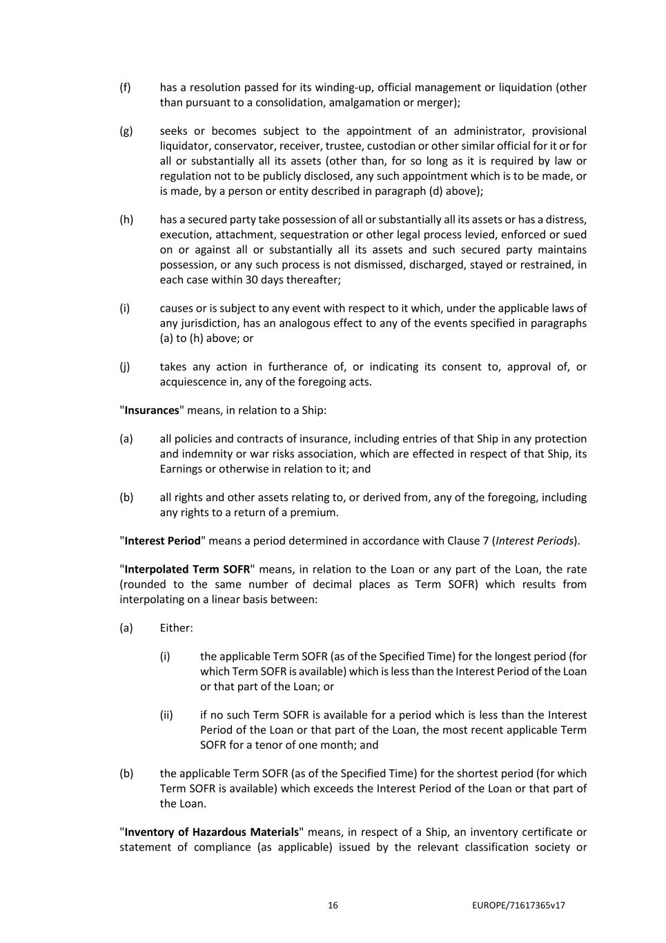 16 EUROPE/71617365v17 (f) has a resolution passed for its winding-up, official management or liquidation (other than pursuant to a consolidation, amalgamation or merger); (g) seeks or becomes subject to the appointment of an administrator, provisional liquidator, conservator, receiver, trustee, custodian or other similar official for it or for all or substantially all its assets (other than, for so long as it is required by law or regulation not to be publicly disclosed, any such appointment which is to be made, or is made, by a person or entity described in paragraph (d) above); (h) has a secured party take possession of all or substantially all its assets or has a distress, execution, attachment, sequestration or other legal process levied, enforced or sued on or against all or substantially all its assets and such secured party maintains possession, or any such process is not dismissed, discharged, stayed or restrained, in each case within 30 days thereafter; (i) causes or is subject to any event with respect to it which, under the applicable laws of any jurisdiction, has an analogous effect to any of the events specified in paragraphs (a) to (h) above; or (j) takes any action in furtherance of, or indicating its consent to, approval of, or acquiescence in, any of the foregoing acts. "Insurances" means, in relation to a Ship: (a) all policies and contracts of insurance, including entries of that Ship in any protection and indemnity or war risks association, which are effected in respect of that Ship, its Earnings or otherwise in relation to it; and (b) all rights and other assets relating to, or derived from, any of the foregoing, including any rights to a return of a premium. "Interest Period" means a period determined in accordance with Clause 7 (Interest Periods). "Interpolated Term SOFR" means, in relation to the Loan or any part of the Loan, the rate (rounded to the same number of decimal places as Term SOFR) which results from interpolating on a linear basis between: (a) Either: (i) the applicable Term SOFR (as of the Specified Time) for the longest period (for which Term SOFR is available) which is less than the Interest Period of the Loan or that part of the Loan; or (ii) if no such Term SOFR is available for a period which is less than the Interest Period of the Loan or that part of the Loan, the most recent applicable Term SOFR for a tenor of one month; and (b) the applicable Term SOFR (as of the Specified Time) for the shortest period (for which Term SOFR is available) which exceeds the Interest Period of the Loan or that part of the Loan. "Inventory of Hazardous Materials" means, in respect of a Ship, an inventory certificate or statement of compliance (as applicable) issued by the relevant classification society or