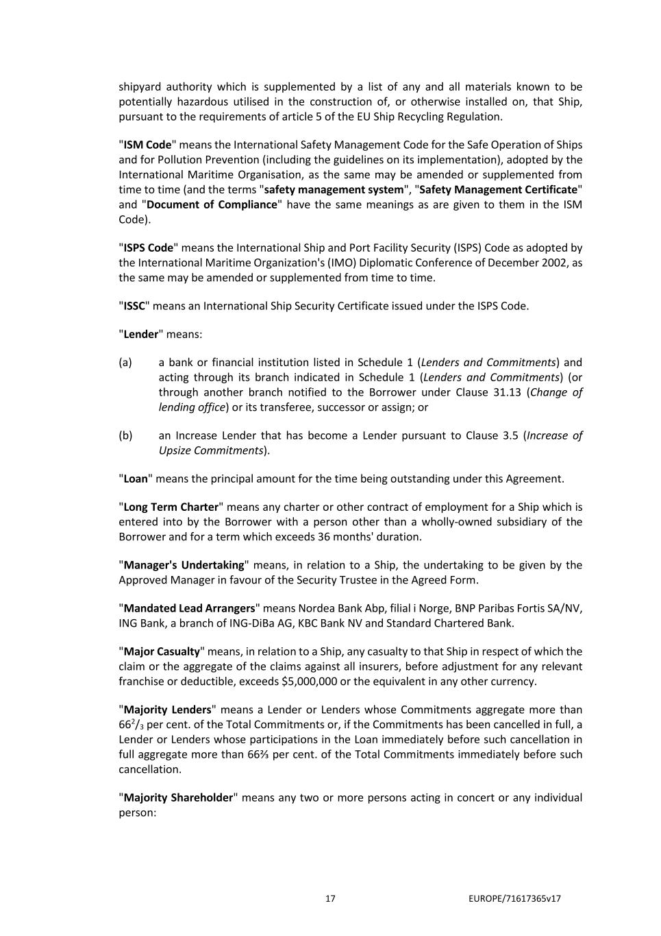 17 EUROPE/71617365v17 shipyard authority which is supplemented by a list of any and all materials known to be potentially hazardous utilised in the construction of, or otherwise installed on, that Ship, pursuant to the requirements of article 5 of the EU Ship Recycling Regulation. "ISM Code" means the International Safety Management Code for the Safe Operation of Ships and for Pollution Prevention (including the guidelines on its implementation), adopted by the International Maritime Organisation, as the same may be amended or supplemented from time to time (and the terms "safety management system", "Safety Management Certificate" and "Document of Compliance" have the same meanings as are given to them in the ISM Code). "ISPS Code" means the International Ship and Port Facility Security (ISPS) Code as adopted by the International Maritime Organization's (IMO) Diplomatic Conference of December 2002, as the same may be amended or supplemented from time to time. "ISSC" means an International Ship Security Certificate issued under the ISPS Code. "Lender" means: (a) a bank or financial institution listed in Schedule 1 (Lenders and Commitments) and acting through its branch indicated in Schedule 1 (Lenders and Commitments) (or through another branch notified to the Borrower under Clause 31.13 (Change of lending office) or its transferee, successor or assign; or (b) an Increase Lender that has become a Lender pursuant to Clause 3.5 (Increase of Upsize Commitments). "Loan" means the principal amount for the time being outstanding under this Agreement. "Long Term Charter" means any charter or other contract of employment for a Ship which is entered into by the Borrower with a person other than a wholly-owned subsidiary of the Borrower and for a term which exceeds 36 months' duration. "Manager's Undertaking" means, in relation to a Ship, the undertaking to be given by the Approved Manager in favour of the Security Trustee in the Agreed Form. "Mandated Lead Arrangers" means Nordea Bank Abp, filial i Norge, BNP Paribas Fortis SA/NV, ING Bank, a branch of ING-DiBa AG, KBC Bank NV and Standard Chartered Bank. "Major Casualty" means, in relation to a Ship, any casualty to that Ship in respect of which the claim or the aggregate of the claims against all insurers, before adjustment for any relevant franchise or deductible, exceeds $5,000,000 or the equivalent in any other currency. "Majority Lenders" means a Lender or Lenders whose Commitments aggregate more than 662/3 per cent. of the Total Commitments or, if the Commitments has been cancelled in full, a Lender or Lenders whose participations in the Loan immediately before such cancellation in full aggregate more than 66⅔ per cent. of the Total Commitments immediately before such cancellation. "Majority Shareholder" means any two or more persons acting in concert or any individual person: