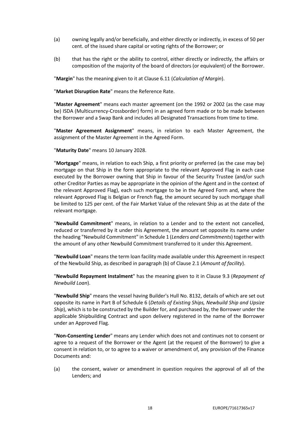 18 EUROPE/71617365v17 (a) owning legally and/or beneficially, and either directly or indirectly, in excess of 50 per cent. of the issued share capital or voting rights of the Borrower; or (b) that has the right or the ability to control, either directly or indirectly, the affairs or composition of the majority of the board of directors (or equivalent) of the Borrower. "Margin" has the meaning given to it at Clause 6.11 (Calculation of Margin). "Market Disruption Rate" means the Reference Rate. "Master Agreement" means each master agreement (on the 1992 or 2002 (as the case may be) ISDA (Multicurrency-Crossborder) form) in an agreed form made or to be made between the Borrower and a Swap Bank and includes all Designated Transactions from time to time. "Master Agreement Assignment" means, in relation to each Master Agreement, the assignment of the Master Agreement in the Agreed Form. "Maturity Date" means 10 January 2028. "Mortgage" means, in relation to each Ship, a first priority or preferred (as the case may be) mortgage on that Ship in the form appropriate to the relevant Approved Flag in each case executed by the Borrower owning that Ship in favour of the Security Trustee (and/or such other Creditor Parties as may be appropriate in the opinion of the Agent and in the context of the relevant Approved Flag), each such mortgage to be in the Agreed Form and, where the relevant Approved Flag is Belgian or French flag, the amount secured by such mortgage shall be limited to 125 per cent. of the Fair Market Value of the relevant Ship as at the date of the relevant mortgage. "Newbuild Commitment" means, in relation to a Lender and to the extent not cancelled, reduced or transferred by it under this Agreement, the amount set opposite its name under the heading "Newbuild Commitment" in Schedule 1 (Lenders and Commitments) together with the amount of any other Newbuild Commitment transferred to it under this Agreement. "Newbuild Loan" means the term loan facility made available under this Agreement in respect of the Newbuild Ship, as described in paragraph (b) of Clause 2.1 (Amount of facility). "Newbuild Repayment Instalment" has the meaning given to it in Clause 9.3 (Repayment of Newbuild Loan). "Newbuild Ship" means the vessel having Builder's Hull No. 8132, details of which are set out opposite its name in Part B of Schedule 6 (Details of Existing Ships, Newbuild Ship and Upsize Ship), which is to be constructed by the Builder for, and purchased by, the Borrower under the applicable Shipbuilding Contract and upon delivery registered in the name of the Borrower under an Approved Flag. "Non-Consenting Lender" means any Lender which does not and continues not to consent or agree to a request of the Borrower or the Agent (at the request of the Borrower) to give a consent in relation to, or to agree to a waiver or amendment of, any provision of the Finance Documents and: (a) the consent, waiver or amendment in question requires the approval of all of the Lenders; and