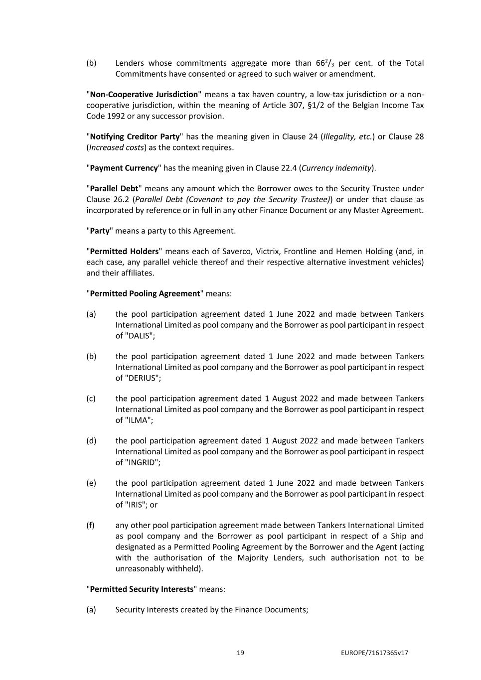 19 EUROPE/71617365v17 (b) Lenders whose commitments aggregate more than 662/3 per cent. of the Total Commitments have consented or agreed to such waiver or amendment. "Non-Cooperative Jurisdiction" means a tax haven country, a low-tax jurisdiction or a non- cooperative jurisdiction, within the meaning of Article 307, §1/2 of the Belgian Income Tax Code 1992 or any successor provision. "Notifying Creditor Party" has the meaning given in Clause 24 (Illegality, etc.) or Clause 28 (Increased costs) as the context requires. "Payment Currency" has the meaning given in Clause 22.4 (Currency indemnity). "Parallel Debt" means any amount which the Borrower owes to the Security Trustee under Clause 26.2 (Parallel Debt (Covenant to pay the Security Trustee)) or under that clause as incorporated by reference or in full in any other Finance Document or any Master Agreement. "Party" means a party to this Agreement. "Permitted Holders" means each of Saverco, Victrix, Frontline and Hemen Holding (and, in each case, any parallel vehicle thereof and their respective alternative investment vehicles) and their affiliates. "Permitted Pooling Agreement" means: (a) the pool participation agreement dated 1 June 2022 and made between Tankers International Limited as pool company and the Borrower as pool participant in respect of "DALIS"; (b) the pool participation agreement dated 1 June 2022 and made between Tankers International Limited as pool company and the Borrower as pool participant in respect of "DERIUS"; (c) the pool participation agreement dated 1 August 2022 and made between Tankers International Limited as pool company and the Borrower as pool participant in respect of "ILMA"; (d) the pool participation agreement dated 1 August 2022 and made between Tankers International Limited as pool company and the Borrower as pool participant in respect of "INGRID"; (e) the pool participation agreement dated 1 June 2022 and made between Tankers International Limited as pool company and the Borrower as pool participant in respect of "IRIS"; or (f) any other pool participation agreement made between Tankers International Limited as pool company and the Borrower as pool participant in respect of a Ship and designated as a Permitted Pooling Agreement by the Borrower and the Agent (acting with the authorisation of the Majority Lenders, such authorisation not to be unreasonably withheld). "Permitted Security Interests" means: (a) Security Interests created by the Finance Documents;