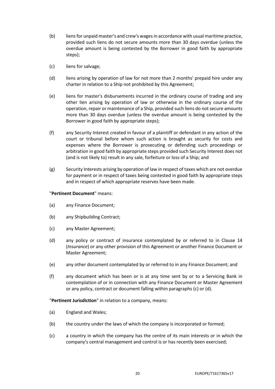 20 EUROPE/71617365v17 (b) liens for unpaid master's and crew's wages in accordance with usual maritime practice, provided such liens do not secure amounts more than 30 days overdue (unless the overdue amount is being contested by the Borrower in good faith by appropriate steps); (c) liens for salvage; (d) liens arising by operation of law for not more than 2 months' prepaid hire under any charter in relation to a Ship not prohibited by this Agreement; (e) liens for master's disbursements incurred in the ordinary course of trading and any other lien arising by operation of law or otherwise in the ordinary course of the operation, repair or maintenance of a Ship, provided such liens do not secure amounts more than 30 days overdue (unless the overdue amount is being contested by the Borrower in good faith by appropriate steps); (f) any Security Interest created in favour of a plaintiff or defendant in any action of the court or tribunal before whom such action is brought as security for costs and expenses where the Borrower is prosecuting or defending such proceedings or arbitration in good faith by appropriate steps provided such Security Interest does not (and is not likely to) result in any sale, forfeiture or loss of a Ship; and (g) Security Interests arising by operation of law in respect of taxes which are not overdue for payment or in respect of taxes being contested in good faith by appropriate steps and in respect of which appropriate reserves have been made. "Pertinent Document" means: (a) any Finance Document; (b) any Shipbuilding Contract; (c) any Master Agreement; (d) any policy or contract of insurance contemplated by or referred to in Clause 14 (Insurance) or any other provision of this Agreement or another Finance Document or Master Agreement; (e) any other document contemplated by or referred to in any Finance Document; and (f) any document which has been or is at any time sent by or to a Servicing Bank in contemplation of or in connection with any Finance Document or Master Agreement or any policy, contract or document falling within paragraphs (c) or (d). "Pertinent Jurisdiction" in relation to a company, means: (a) England and Wales; (b) the country under the laws of which the company is incorporated or formed; (c) a country in which the company has the centre of its main interests or in which the company's central management and control is or has recently been exercised;