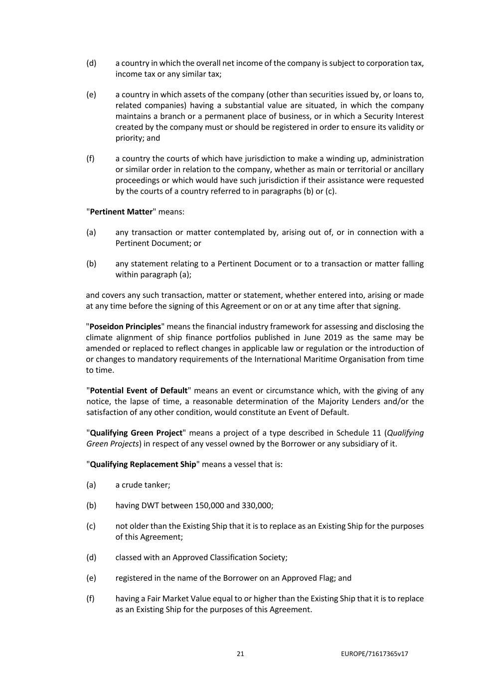 21 EUROPE/71617365v17 (d) a country in which the overall net income of the company is subject to corporation tax, income tax or any similar tax; (e) a country in which assets of the company (other than securities issued by, or loans to, related companies) having a substantial value are situated, in which the company maintains a branch or a permanent place of business, or in which a Security Interest created by the company must or should be registered in order to ensure its validity or priority; and (f) a country the courts of which have jurisdiction to make a winding up, administration or similar order in relation to the company, whether as main or territorial or ancillary proceedings or which would have such jurisdiction if their assistance were requested by the courts of a country referred to in paragraphs (b) or (c). "Pertinent Matter" means: (a) any transaction or matter contemplated by, arising out of, or in connection with a Pertinent Document; or (b) any statement relating to a Pertinent Document or to a transaction or matter falling within paragraph (a); and covers any such transaction, matter or statement, whether entered into, arising or made at any time before the signing of this Agreement or on or at any time after that signing. "Poseidon Principles" means the financial industry framework for assessing and disclosing the climate alignment of ship finance portfolios published in June 2019 as the same may be amended or replaced to reflect changes in applicable law or regulation or the introduction of or changes to mandatory requirements of the International Maritime Organisation from time to time. "Potential Event of Default" means an event or circumstance which, with the giving of any notice, the lapse of time, a reasonable determination of the Majority Lenders and/or the satisfaction of any other condition, would constitute an Event of Default. "Qualifying Green Project" means a project of a type described in Schedule 11 (Qualifying Green Projects) in respect of any vessel owned by the Borrower or any subsidiary of it. "Qualifying Replacement Ship" means a vessel that is: (a) a crude tanker; (b) having DWT between 150,000 and 330,000; (c) not older than the Existing Ship that it is to replace as an Existing Ship for the purposes of this Agreement; (d) classed with an Approved Classification Society; (e) registered in the name of the Borrower on an Approved Flag; and (f) having a Fair Market Value equal to or higher than the Existing Ship that it is to replace as an Existing Ship for the purposes of this Agreement.