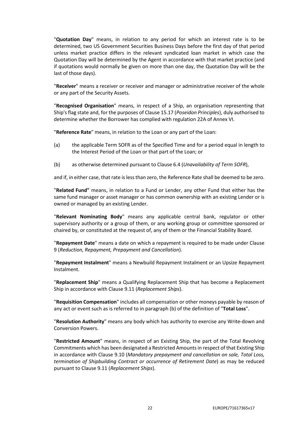 22 EUROPE/71617365v17 "Quotation Day" means, in relation to any period for which an interest rate is to be determined, two US Government Securities Business Days before the first day of that period unless market practice differs in the relevant syndicated loan market in which case the Quotation Day will be determined by the Agent in accordance with that market practice (and if quotations would normally be given on more than one day, the Quotation Day will be the last of those days). "Receiver" means a receiver or receiver and manager or administrative receiver of the whole or any part of the Security Assets. "Recognised Organisation" means, in respect of a Ship, an organisation representing that Ship's flag state and, for the purposes of Clause 15.17 (Poseidon Principles), duly authorised to determine whether the Borrower has complied with regulation 22A of Annex VI. "Reference Rate" means, in relation to the Loan or any part of the Loan: (a) the applicable Term SOFR as of the Specified Time and for a period equal in length to the Interest Period of the Loan or that part of the Loan; or (b) as otherwise determined pursuant to Clause 6.4 (Unavailability of Term SOFR), and if, in either case, that rate is less than zero, the Reference Rate shall be deemed to be zero. "Related Fund" means, in relation to a Fund or Lender, any other Fund that either has the same fund manager or asset manager or has common ownership with an existing Lender or is owned or managed by an existing Lender. "Relevant Nominating Body" means any applicable central bank, regulator or other supervisory authority or a group of them, or any working group or committee sponsored or chaired by, or constituted at the request of, any of them or the Financial Stability Board. "Repayment Date" means a date on which a repayment is required to be made under Clause 9 (Reduction, Repayment, Prepayment and Cancellation). "Repayment Instalment" means a Newbuild Repayment Instalment or an Upsize Repayment Instalment. "Replacement Ship" means a Qualifying Replacement Ship that has become a Replacement Ship in accordance with Clause 9.11 (Replacement Ships). "Requisition Compensation" includes all compensation or other moneys payable by reason of any act or event such as is referred to in paragraph (b) of the definition of "Total Loss". "Resolution Authority" means any body which has authority to exercise any Write-down and Conversion Powers. "Restricted Amount" means, in respect of an Existing Ship, the part of the Total Revolving Commitments which has been designated a Restricted Amounts in respect of that Existing Ship in accordance with Clause 9.10 (Mandatory prepayment and cancellation on sale, Total Loss, termination of Shipbuilding Contract or occurrence of Retirement Date) as may be reduced pursuant to Clause 9.11 (Replacement Ships).
