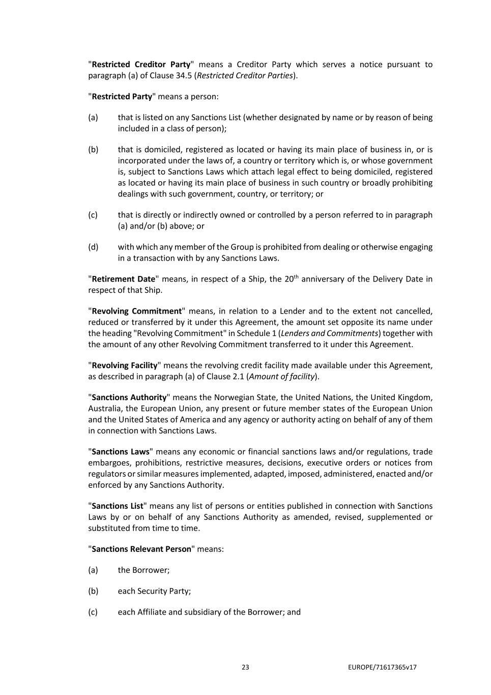 23 EUROPE/71617365v17 "Restricted Creditor Party" means a Creditor Party which serves a notice pursuant to paragraph (a) of Clause 34.5 (Restricted Creditor Parties). "Restricted Party" means a person: (a) that is listed on any Sanctions List (whether designated by name or by reason of being included in a class of person); (b) that is domiciled, registered as located or having its main place of business in, or is incorporated under the laws of, a country or territory which is, or whose government is, subject to Sanctions Laws which attach legal effect to being domiciled, registered as located or having its main place of business in such country or broadly prohibiting dealings with such government, country, or territory; or (c) that is directly or indirectly owned or controlled by a person referred to in paragraph (a) and/or (b) above; or (d) with which any member of the Group is prohibited from dealing or otherwise engaging in a transaction with by any Sanctions Laws. "Retirement Date" means, in respect of a Ship, the 20th anniversary of the Delivery Date in respect of that Ship. "Revolving Commitment" means, in relation to a Lender and to the extent not cancelled, reduced or transferred by it under this Agreement, the amount set opposite its name under the heading "Revolving Commitment" in Schedule 1 (Lenders and Commitments) together with the amount of any other Revolving Commitment transferred to it under this Agreement. "Revolving Facility" means the revolving credit facility made available under this Agreement, as described in paragraph (a) of Clause 2.1 (Amount of facility). "Sanctions Authority" means the Norwegian State, the United Nations, the United Kingdom, Australia, the European Union, any present or future member states of the European Union and the United States of America and any agency or authority acting on behalf of any of them in connection with Sanctions Laws. "Sanctions Laws" means any economic or financial sanctions laws and/or regulations, trade embargoes, prohibitions, restrictive measures, decisions, executive orders or notices from regulators or similar measures implemented, adapted, imposed, administered, enacted and/or enforced by any Sanctions Authority. "Sanctions List" means any list of persons or entities published in connection with Sanctions Laws by or on behalf of any Sanctions Authority as amended, revised, supplemented or substituted from time to time. "Sanctions Relevant Person" means: (a) the Borrower; (b) each Security Party; (c) each Affiliate and subsidiary of the Borrower; and