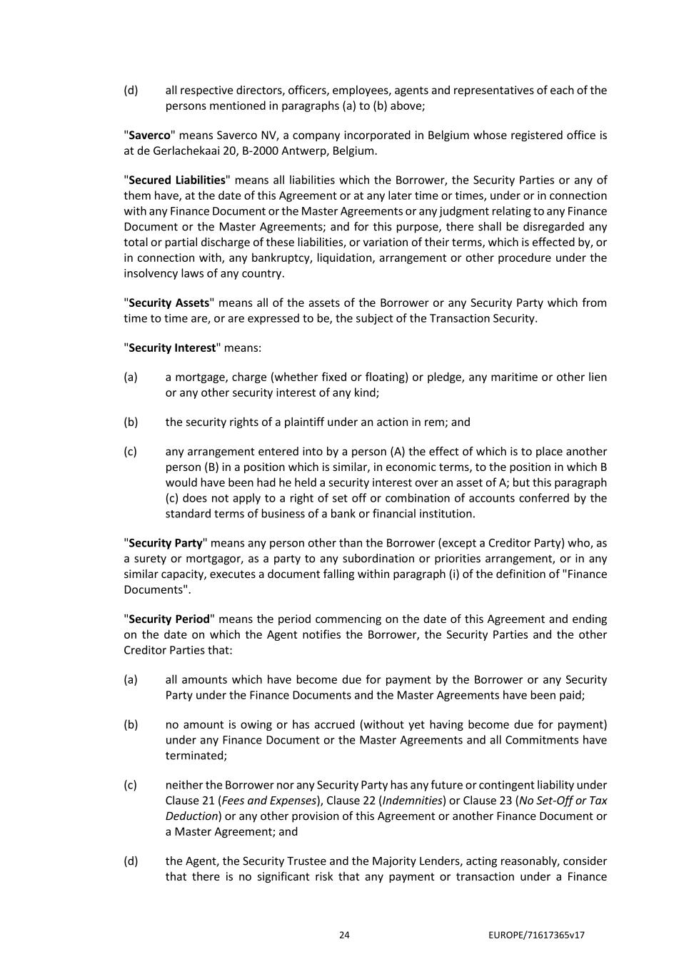 24 EUROPE/71617365v17 (d) all respective directors, officers, employees, agents and representatives of each of the persons mentioned in paragraphs (a) to (b) above; "Saverco" means Saverco NV, a company incorporated in Belgium whose registered office is at de Gerlachekaai 20, B-2000 Antwerp, Belgium. "Secured Liabilities" means all liabilities which the Borrower, the Security Parties or any of them have, at the date of this Agreement or at any later time or times, under or in connection with any Finance Document or the Master Agreements or any judgment relating to any Finance Document or the Master Agreements; and for this purpose, there shall be disregarded any total or partial discharge of these liabilities, or variation of their terms, which is effected by, or in connection with, any bankruptcy, liquidation, arrangement or other procedure under the insolvency laws of any country. "Security Assets" means all of the assets of the Borrower or any Security Party which from time to time are, or are expressed to be, the subject of the Transaction Security. "Security Interest" means: (a) a mortgage, charge (whether fixed or floating) or pledge, any maritime or other lien or any other security interest of any kind; (b) the security rights of a plaintiff under an action in rem; and (c) any arrangement entered into by a person (A) the effect of which is to place another person (B) in a position which is similar, in economic terms, to the position in which B would have been had he held a security interest over an asset of A; but this paragraph (c) does not apply to a right of set off or combination of accounts conferred by the standard terms of business of a bank or financial institution. "Security Party" means any person other than the Borrower (except a Creditor Party) who, as a surety or mortgagor, as a party to any subordination or priorities arrangement, or in any similar capacity, executes a document falling within paragraph (i) of the definition of "Finance Documents". "Security Period" means the period commencing on the date of this Agreement and ending on the date on which the Agent notifies the Borrower, the Security Parties and the other Creditor Parties that: (a) all amounts which have become due for payment by the Borrower or any Security Party under the Finance Documents and the Master Agreements have been paid; (b) no amount is owing or has accrued (without yet having become due for payment) under any Finance Document or the Master Agreements and all Commitments have terminated; (c) neither the Borrower nor any Security Party has any future or contingent liability under Clause 21 (Fees and Expenses), Clause 22 (Indemnities) or Clause 23 (No Set-Off or Tax Deduction) or any other provision of this Agreement or another Finance Document or a Master Agreement; and (d) the Agent, the Security Trustee and the Majority Lenders, acting reasonably, consider that there is no significant risk that any payment or transaction under a Finance