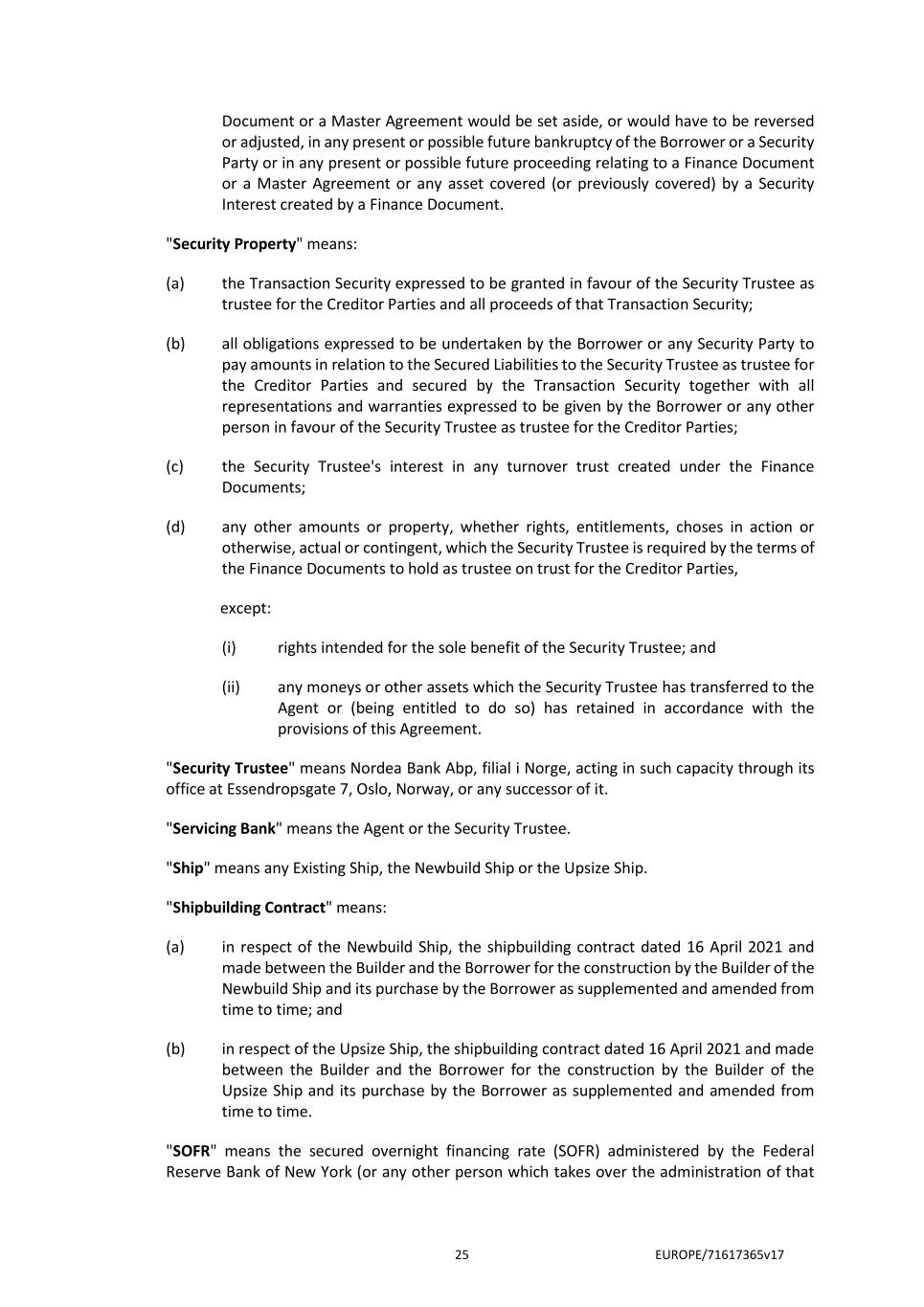 25 EUROPE/71617365v17 Document or a Master Agreement would be set aside, or would have to be reversed or adjusted, in any present or possible future bankruptcy of the Borrower or a Security Party or in any present or possible future proceeding relating to a Finance Document or a Master Agreement or any asset covered (or previously covered) by a Security Interest created by a Finance Document. "Security Property" means: (a) the Transaction Security expressed to be granted in favour of the Security Trustee as trustee for the Creditor Parties and all proceeds of that Transaction Security; (b) all obligations expressed to be undertaken by the Borrower or any Security Party to pay amounts in relation to the Secured Liabilities to the Security Trustee as trustee for the Creditor Parties and secured by the Transaction Security together with all representations and warranties expressed to be given by the Borrower or any other person in favour of the Security Trustee as trustee for the Creditor Parties; (c) the Security Trustee's interest in any turnover trust created under the Finance Documents; (d) any other amounts or property, whether rights, entitlements, choses in action or otherwise, actual or contingent, which the Security Trustee is required by the terms of the Finance Documents to hold as trustee on trust for the Creditor Parties, except: (i) rights intended for the sole benefit of the Security Trustee; and (ii) any moneys or other assets which the Security Trustee has transferred to the Agent or (being entitled to do so) has retained in accordance with the provisions of this Agreement. "Security Trustee" means Nordea Bank Abp, filial i Norge, acting in such capacity through its office at Essendropsgate 7, Oslo, Norway, or any successor of it. "Servicing Bank" means the Agent or the Security Trustee. "Ship" means any Existing Ship, the Newbuild Ship or the Upsize Ship. "Shipbuilding Contract" means: (a) in respect of the Newbuild Ship, the shipbuilding contract dated 16 April 2021 and made between the Builder and the Borrower for the construction by the Builder of the Newbuild Ship and its purchase by the Borrower as supplemented and amended from time to time; and (b) in respect of the Upsize Ship, the shipbuilding contract dated 16 April 2021 and made between the Builder and the Borrower for the construction by the Builder of the Upsize Ship and its purchase by the Borrower as supplemented and amended from time to time. "SOFR" means the secured overnight financing rate (SOFR) administered by the Federal Reserve Bank of New York (or any other person which takes over the administration of that