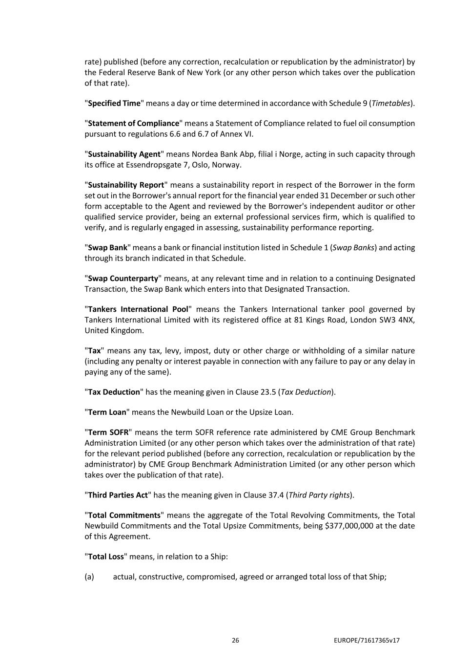 26 EUROPE/71617365v17 rate) published (before any correction, recalculation or republication by the administrator) by the Federal Reserve Bank of New York (or any other person which takes over the publication of that rate). "Specified Time" means a day or time determined in accordance with Schedule 9 (Timetables). "Statement of Compliance" means a Statement of Compliance related to fuel oil consumption pursuant to regulations 6.6 and 6.7 of Annex VI. "Sustainability Agent" means Nordea Bank Abp, filial i Norge, acting in such capacity through its office at Essendropsgate 7, Oslo, Norway. "Sustainability Report" means a sustainability report in respect of the Borrower in the form set out in the Borrower's annual report for the financial year ended 31 December or such other form acceptable to the Agent and reviewed by the Borrower's independent auditor or other qualified service provider, being an external professional services firm, which is qualified to verify, and is regularly engaged in assessing, sustainability performance reporting. "Swap Bank" means a bank or financial institution listed in Schedule 1 (Swap Banks) and acting through its branch indicated in that Schedule. "Swap Counterparty" means, at any relevant time and in relation to a continuing Designated Transaction, the Swap Bank which enters into that Designated Transaction. "Tankers International Pool" means the Tankers International tanker pool governed by Tankers International Limited with its registered office at 81 Kings Road, London SW3 4NX, United Kingdom. "Tax" means any tax, levy, impost, duty or other charge or withholding of a similar nature (including any penalty or interest payable in connection with any failure to pay or any delay in paying any of the same). "Tax Deduction" has the meaning given in Clause 23.5 (Tax Deduction). "Term Loan" means the Newbuild Loan or the Upsize Loan. "Term SOFR" means the term SOFR reference rate administered by CME Group Benchmark Administration Limited (or any other person which takes over the administration of that rate) for the relevant period published (before any correction, recalculation or republication by the administrator) by CME Group Benchmark Administration Limited (or any other person which takes over the publication of that rate). "Third Parties Act" has the meaning given in Clause 37.4 (Third Party rights). "Total Commitments" means the aggregate of the Total Revolving Commitments, the Total Newbuild Commitments and the Total Upsize Commitments, being $377,000,000 at the date of this Agreement. "Total Loss" means, in relation to a Ship: (a) actual, constructive, compromised, agreed or arranged total loss of that Ship;