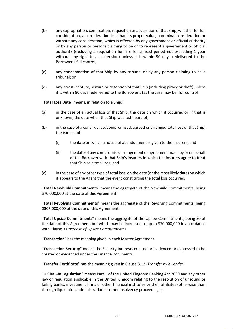 27 EUROPE/71617365v17 (b) any expropriation, confiscation, requisition or acquisition of that Ship, whether for full consideration, a consideration less than its proper value, a nominal consideration or without any consideration, which is effected by any government or official authority or by any person or persons claiming to be or to represent a government or official authority (excluding a requisition for hire for a fixed period not exceeding 1 year without any right to an extension) unless it is within 90 days redelivered to the Borrower's full control; (c) any condemnation of that Ship by any tribunal or by any person claiming to be a tribunal; or (d) any arrest, capture, seizure or detention of that Ship (including piracy or theft) unless it is within 90 days redelivered to the Borrower's (as the case may be) full control. "Total Loss Date" means, in relation to a Ship: (a) in the case of an actual loss of that Ship, the date on which it occurred or, if that is unknown, the date when that Ship was last heard of; (b) in the case of a constructive, compromised, agreed or arranged total loss of that Ship, the earliest of: (i) the date on which a notice of abandonment is given to the insurers; and (ii) the date of any compromise, arrangement or agreement made by or on behalf of the Borrower with that Ship's insurers in which the insurers agree to treat that Ship as a total loss; and (c) in the case of any other type of total loss, on the date (or the most likely date) on which it appears to the Agent that the event constituting the total loss occurred. "Total Newbuild Commitments" means the aggregate of the Newbuild Commitments, being $70,000,000 at the date of this Agreement. "Total Revolving Commitments" means the aggregate of the Revolving Commitments, being $307,000,000 at the date of this Agreement. "Total Upsize Commitments" means the aggregate of the Upsize Commitments, being $0 at the date of this Agreement, but which may be increased to up to $70,000,000 in accordance with Clause 3 (Increase of Upsize Commitments). "Transaction" has the meaning given in each Master Agreement. "Transaction Security" means the Security Interests created or evidenced or expressed to be created or evidenced under the Finance Documents. "Transfer Certificate" has the meaning given in Clause 31.2 (Transfer by a Lender). "UK Bail-In Legislation" means Part 1 of the United Kingdom Banking Act 2009 and any other law or regulation applicable in the United Kingdom relating to the resolution of unsound or failing banks, investment firms or other financial institutes or their affiliates (otherwise than through liquidation, administration or other insolvency proceedings).