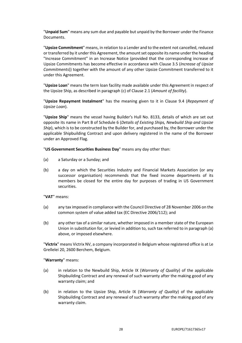 28 EUROPE/71617365v17 "Unpaid Sum" means any sum due and payable but unpaid by the Borrower under the Finance Documents. "Upsize Commitment" means, in relation to a Lender and to the extent not cancelled, reduced or transferred by it under this Agreement, the amount set opposite its name under the heading "Increase Commitment" in an Increase Notice (provided that the corresponding increase of Upsize Commitments has become effective in accordance with Clause 3.5 (Increase of Upsize Commitments)) together with the amount of any other Upsize Commitment transferred to it under this Agreement. "Upsize Loan" means the term loan facility made available under this Agreement in respect of the Upsize Ship, as described in paragraph (c) of Clause 2.1 (Amount of facility). "Upsize Repayment Instalment" has the meaning given to it in Clause 9.4 (Repayment of Upsize Loan). "Upsize Ship" means the vessel having Builder's Hull No. 8133, details of which are set out opposite its name in Part B of Schedule 6 (Details of Existing Ships, Newbuild Ship and Upsize Ship), which is to be constructed by the Builder for, and purchased by, the Borrower under the applicable Shipbuilding Contract and upon delivery registered in the name of the Borrower under an Approved Flag. "US Government Securities Business Day" means any day other than: (a) a Saturday or a Sunday; and (b) a day on which the Securities Industry and Financial Markets Association (or any successor organisation) recommends that the fixed income departments of its members be closed for the entire day for purposes of trading in US Government securities. "VAT" means: (a) any tax imposed in compliance with the Council Directive of 28 November 2006 on the common system of value added tax (EC Directive 2006/112); and (b) any other tax of a similar nature, whether imposed in a member state of the European Union in substitution for, or levied in addition to, such tax referred to in paragraph (a) above, or imposed elsewhere. "Victrix" means Victrix NV, a company incorporated in Belgium whose registered office is at Le Grellelei 20, 2600 Berchem, Belgium. "Warranty" means: (a) in relation to the Newbuild Ship, Article IX (Warranty of Quality) of the applicable Shipbuilding Contract and any renewal of such warranty after the making good of any warranty claim; and (b) in relation to the Upsize Ship, Article IX (Warranty of Quality) of the applicable Shipbuilding Contract and any renewal of such warranty after the making good of any warranty claim.