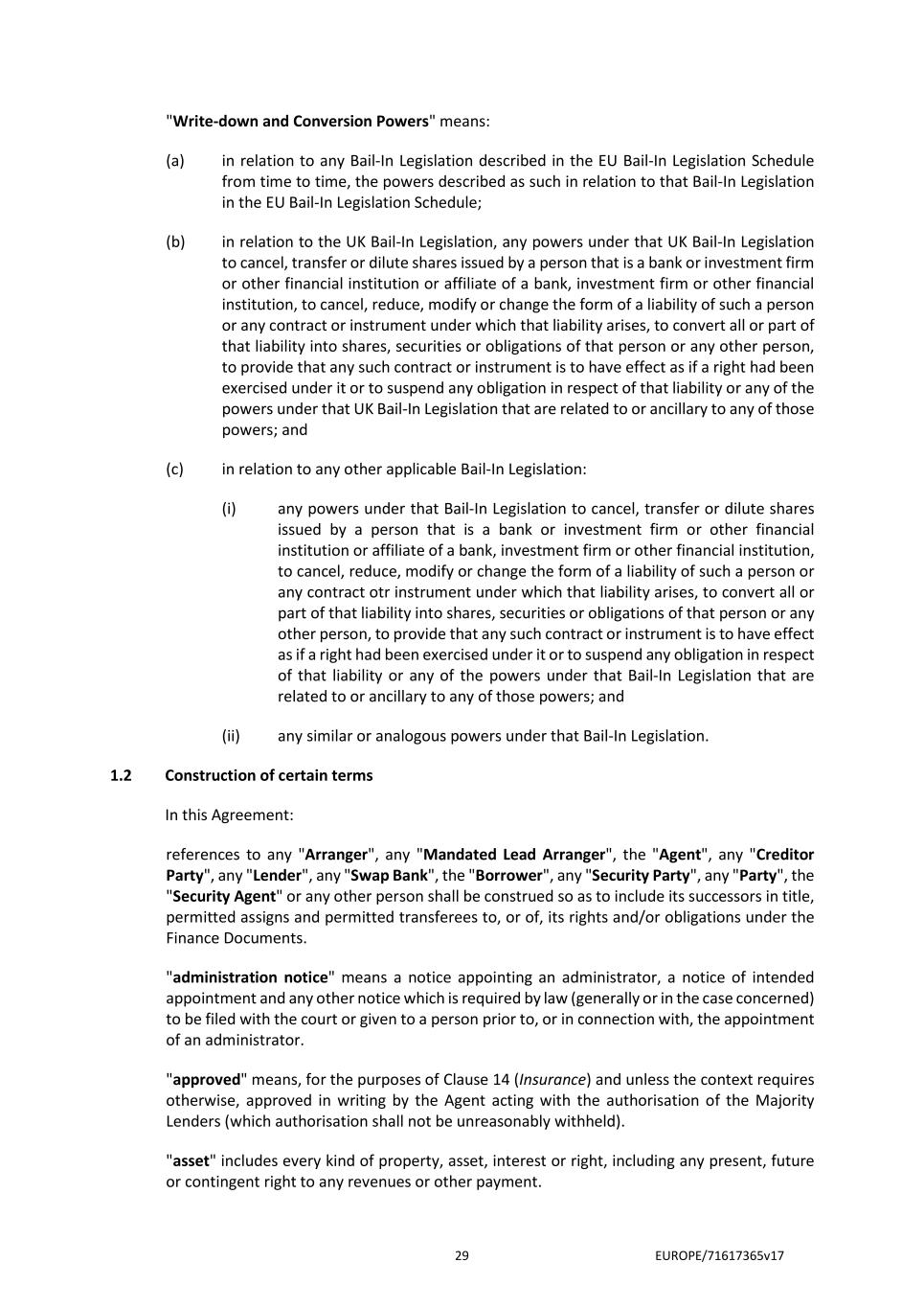 29 EUROPE/71617365v17 "Write-down and Conversion Powers" means: (a) in relation to any Bail-In Legislation described in the EU Bail-In Legislation Schedule from time to time, the powers described as such in relation to that Bail-In Legislation in the EU Bail-In Legislation Schedule; (b) in relation to the UK Bail-In Legislation, any powers under that UK Bail-In Legislation to cancel, transfer or dilute shares issued by a person that is a bank or investment firm or other financial institution or affiliate of a bank, investment firm or other financial institution, to cancel, reduce, modify or change the form of a liability of such a person or any contract or instrument under which that liability arises, to convert all or part of that liability into shares, securities or obligations of that person or any other person, to provide that any such contract or instrument is to have effect as if a right had been exercised under it or to suspend any obligation in respect of that liability or any of the powers under that UK Bail-In Legislation that are related to or ancillary to any of those powers; and (c) in relation to any other applicable Bail-In Legislation: (i) any powers under that Bail-In Legislation to cancel, transfer or dilute shares issued by a person that is a bank or investment firm or other financial institution or affiliate of a bank, investment firm or other financial institution, to cancel, reduce, modify or change the form of a liability of such a person or any contract otr instrument under which that liability arises, to convert all or part of that liability into shares, securities or obligations of that person or any other person, to provide that any such contract or instrument is to have effect as if a right had been exercised under it or to suspend any obligation in respect of that liability or any of the powers under that Bail-In Legislation that are related to or ancillary to any of those powers; and (ii) any similar or analogous powers under that Bail-In Legislation. 1.2 Construction of certain terms In this Agreement: references to any "Arranger", any "Mandated Lead Arranger", the "Agent", any "Creditor Party", any "Lender", any "Swap Bank", the "Borrower", any "Security Party", any "Party", the "Security Agent" or any other person shall be construed so as to include its successors in title, permitted assigns and permitted transferees to, or of, its rights and/or obligations under the Finance Documents. "administration notice" means a notice appointing an administrator, a notice of intended appointment and any other notice which is required by law (generally or in the case concerned) to be filed with the court or given to a person prior to, or in connection with, the appointment of an administrator. "approved" means, for the purposes of Clause 14 (Insurance) and unless the context requires otherwise, approved in writing by the Agent acting with the authorisation of the Majority Lenders (which authorisation shall not be unreasonably withheld). "asset" includes every kind of property, asset, interest or right, including any present, future or contingent right to any revenues or other payment.