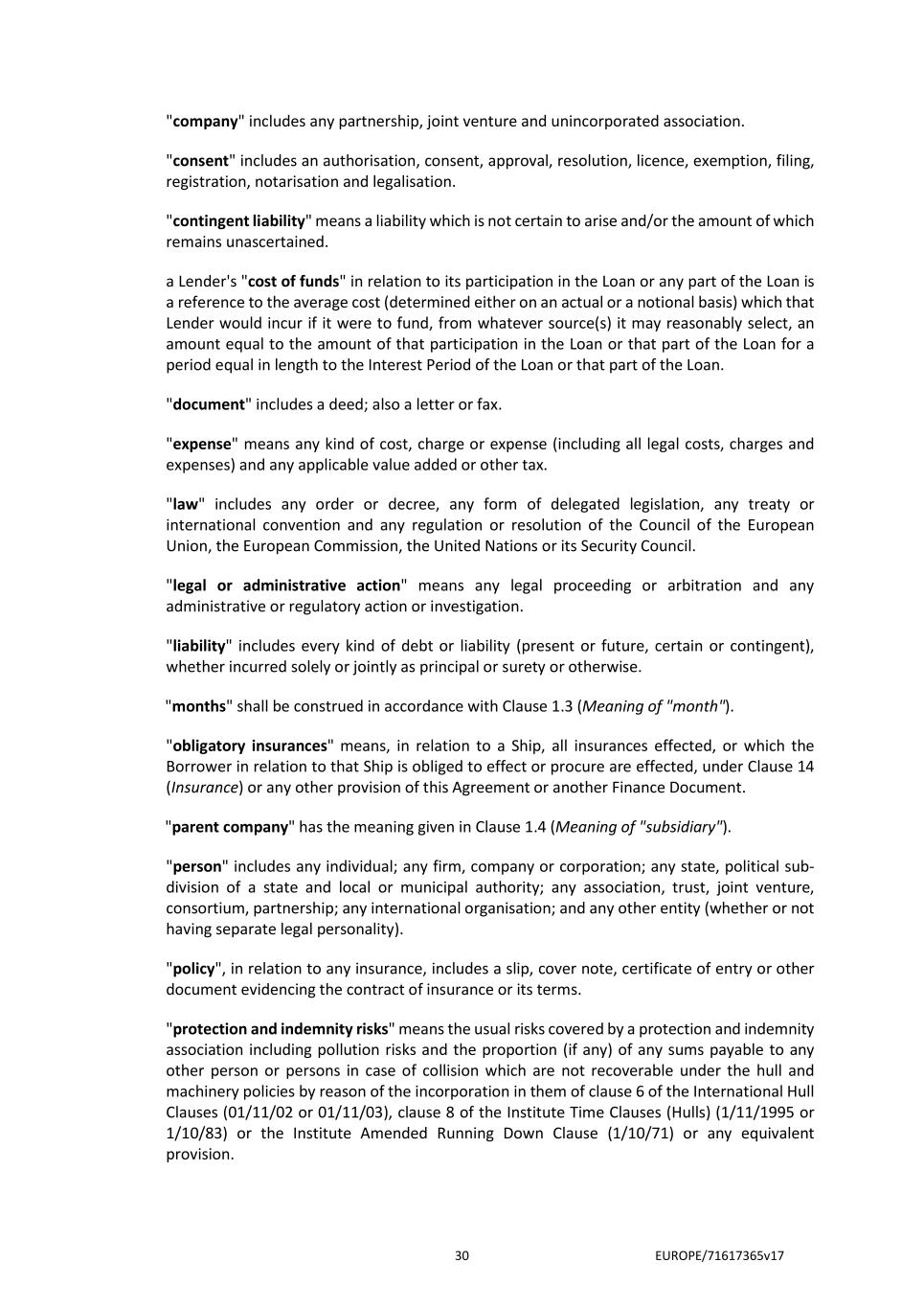 30 EUROPE/71617365v17 "company" includes any partnership, joint venture and unincorporated association. "consent" includes an authorisation, consent, approval, resolution, licence, exemption, filing, registration, notarisation and legalisation. "contingent liability" means a liability which is not certain to arise and/or the amount of which remains unascertained. a Lender's "cost of funds" in relation to its participation in the Loan or any part of the Loan is a reference to the average cost (determined either on an actual or a notional basis) which that Lender would incur if it were to fund, from whatever source(s) it may reasonably select, an amount equal to the amount of that participation in the Loan or that part of the Loan for a period equal in length to the Interest Period of the Loan or that part of the Loan. "document" includes a deed; also a letter or fax. "expense" means any kind of cost, charge or expense (including all legal costs, charges and expenses) and any applicable value added or other tax. "law" includes any order or decree, any form of delegated legislation, any treaty or international convention and any regulation or resolution of the Council of the European Union, the European Commission, the United Nations or its Security Council. "legal or administrative action" means any legal proceeding or arbitration and any administrative or regulatory action or investigation. "liability" includes every kind of debt or liability (present or future, certain or contingent), whether incurred solely or jointly as principal or surety or otherwise. "months" shall be construed in accordance with Clause 1.3 (Meaning of "month"). "obligatory insurances" means, in relation to a Ship, all insurances effected, or which the Borrower in relation to that Ship is obliged to effect or procure are effected, under Clause 14 (Insurance) or any other provision of this Agreement or another Finance Document. "parent company" has the meaning given in Clause 1.4 (Meaning of "subsidiary"). "person" includes any individual; any firm, company or corporation; any state, political sub- division of a state and local or municipal authority; any association, trust, joint venture, consortium, partnership; any international organisation; and any other entity (whether or not having separate legal personality). "policy", in relation to any insurance, includes a slip, cover note, certificate of entry or other document evidencing the contract of insurance or its terms. "protection and indemnity risks" means the usual risks covered by a protection and indemnity association including pollution risks and the proportion (if any) of any sums payable to any other person or persons in case of collision which are not recoverable under the hull and machinery policies by reason of the incorporation in them of clause 6 of the International Hull Clauses (01/11/02 or 01/11/03), clause 8 of the Institute Time Clauses (Hulls) (1/11/1995 or 1/10/83) or the Institute Amended Running Down Clause (1/10/71) or any equivalent provision.