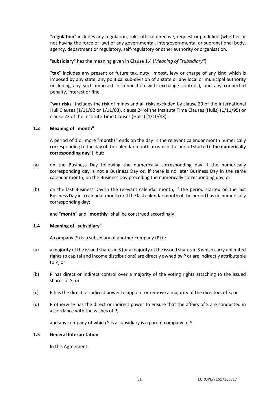 31 EUROPE/71617365v17 "regulation" includes any regulation, rule, official directive, request or guideline (whether or not having the force of law) of any governmental, intergovernmental or supranational body, agency, department or regulatory, self-regulatory or other authority or organisation. "subsidiary" has the meaning given in Clause 1.4 (Meaning of "subsidiary"). "tax" includes any present or future tax, duty, impost, levy or charge of any kind which is imposed by any state, any political sub-division of a state or any local or municipal authority (including any such imposed in connection with exchange controls), and any connected penalty, interest or fine. "war risks" includes the risk of mines and all risks excluded by clause 29 of the International Hull Clauses (1/11/02 or 1/11/03), clause 24 of the Institute Time Clauses (Hulls) (1/11/95) or clause 23 of the Institute Time Clauses (Hulls) (1/10/83). 1.3 Meaning of "month" A period of 1 or more "months" ends on the day in the relevant calendar month numerically corresponding to the day of the calendar month on which the period started ("the numerically corresponding day"), but: (a) on the Business Day following the numerically corresponding day if the numerically corresponding day is not a Business Day or, if there is no later Business Day in the same calendar month, on the Business Day preceding the numerically corresponding day; or (b) on the last Business Day in the relevant calendar month, if the period started on the last Business Day in a calendar month or if the last calendar month of the period has no numerically corresponding day; and "month" and "monthly" shall be construed accordingly. 1.4 Meaning of "subsidiary" A company (S) is a subsidiary of another company (P) if: (a) a majority of the issued shares in S (or a majority of the issued shares in S which carry unlimited rights to capital and income distributions) are directly owned by P or are indirectly attributable to P; or (b) P has direct or indirect control over a majority of the voting rights attaching to the issued shares of S; or (c) P has the direct or indirect power to appoint or remove a majority of the directors of S; or (d) P otherwise has the direct or indirect power to ensure that the affairs of S are conducted in accordance with the wishes of P; and any company of which S is a subsidiary is a parent company of S. 1.5 General Interpretation In this Agreement: