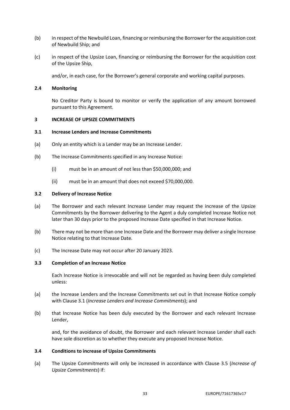 33 EUROPE/71617365v17 (b) in respect of the Newbuild Loan, financing or reimbursing the Borrower for the acquisition cost of Newbuild Ship; and (c) in respect of the Upsize Loan, financing or reimbursing the Borrower for the acquisition cost of the Upsize Ship, and/or, in each case, for the Borrower's general corporate and working capital purposes. 2.4 Monitoring No Creditor Party is bound to monitor or verify the application of any amount borrowed pursuant to this Agreement. 3 INCREASE OF UPSIZE COMMITMENTS 3.1 Increase Lenders and Increase Commitments (a) Only an entity which is a Lender may be an Increase Lender. (b) The Increase Commitments specified in any Increase Notice: (i) must be in an amount of not less than $50,000,000; and (ii) must be in an amount that does not exceed $70,000,000. 3.2 Delivery of Increase Notice (a) The Borrower and each relevant Increase Lender may request the increase of the Upsize Commitments by the Borrower delivering to the Agent a duly completed Increase Notice not later than 30 days prior to the proposed Increase Date specified in that Increase Notice. (b) There may not be more than one Increase Date and the Borrower may deliver a single Increase Notice relating to that Increase Date. (c) The Increase Date may not occur after 20 January 2023. 3.3 Completion of an Increase Notice Each Increase Notice is irrevocable and will not be regarded as having been duly completed unless: (a) the Increase Lenders and the Increase Commitments set out in that Increase Notice comply with Clause 3.1 (Increase Lenders and Increase Commitments); and (b) that Increase Notice has been duly executed by the Borrower and each relevant Increase Lender, and, for the avoidance of doubt, the Borrower and each relevant Increase Lender shall each have sole discretion as to whether they execute any proposed Increase Notice. 3.4 Conditions to increase of Upsize Commitments (a) The Upsize Commitments will only be increased in accordance with Clause 3.5 (Increase of Upsize Commitments) if: