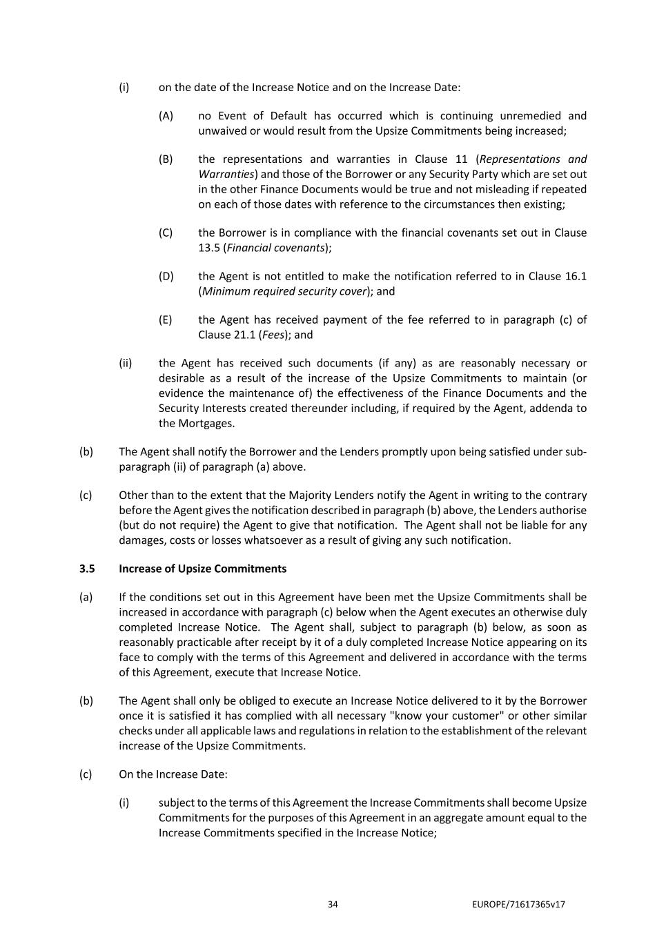 34 EUROPE/71617365v17 (i) on the date of the Increase Notice and on the Increase Date: (A) no Event of Default has occurred which is continuing unremedied and unwaived or would result from the Upsize Commitments being increased; (B) the representations and warranties in Clause 11 (Representations and Warranties) and those of the Borrower or any Security Party which are set out in the other Finance Documents would be true and not misleading if repeated on each of those dates with reference to the circumstances then existing; (C) the Borrower is in compliance with the financial covenants set out in Clause 13.5 (Financial covenants); (D) the Agent is not entitled to make the notification referred to in Clause 16.1 (Minimum required security cover); and (E) the Agent has received payment of the fee referred to in paragraph (c) of Clause 21.1 (Fees); and (ii) the Agent has received such documents (if any) as are reasonably necessary or desirable as a result of the increase of the Upsize Commitments to maintain (or evidence the maintenance of) the effectiveness of the Finance Documents and the Security Interests created thereunder including, if required by the Agent, addenda to the Mortgages. (b) The Agent shall notify the Borrower and the Lenders promptly upon being satisfied under sub- paragraph (ii) of paragraph (a) above. (c) Other than to the extent that the Majority Lenders notify the Agent in writing to the contrary before the Agent gives the notification described in paragraph (b) above, the Lenders authorise (but do not require) the Agent to give that notification. The Agent shall not be liable for any damages, costs or losses whatsoever as a result of giving any such notification. 3.5 Increase of Upsize Commitments (a) If the conditions set out in this Agreement have been met the Upsize Commitments shall be increased in accordance with paragraph (c) below when the Agent executes an otherwise duly completed Increase Notice. The Agent shall, subject to paragraph (b) below, as soon as reasonably practicable after receipt by it of a duly completed Increase Notice appearing on its face to comply with the terms of this Agreement and delivered in accordance with the terms of this Agreement, execute that Increase Notice. (b) The Agent shall only be obliged to execute an Increase Notice delivered to it by the Borrower once it is satisfied it has complied with all necessary "know your customer" or other similar checks under all applicable laws and regulations in relation to the establishment of the relevant increase of the Upsize Commitments. (c) On the Increase Date: (i) subject to the terms of this Agreement the Increase Commitments shall become Upsize Commitments for the purposes of this Agreement in an aggregate amount equal to the Increase Commitments specified in the Increase Notice;
