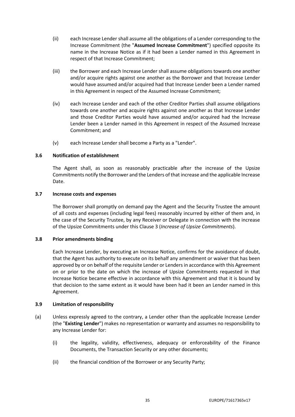 35 EUROPE/71617365v17 (ii) each Increase Lender shall assume all the obligations of a Lender corresponding to the Increase Commitment (the "Assumed Increase Commitment") specified opposite its name in the Increase Notice as if it had been a Lender named in this Agreement in respect of that Increase Commitment; (iii) the Borrower and each Increase Lender shall assume obligations towards one another and/or acquire rights against one another as the Borrower and that Increase Lender would have assumed and/or acquired had that Increase Lender been a Lender named in this Agreement in respect of the Assumed Increase Commitment; (iv) each Increase Lender and each of the other Creditor Parties shall assume obligations towards one another and acquire rights against one another as that Increase Lender and those Creditor Parties would have assumed and/or acquired had the Increase Lender been a Lender named in this Agreement in respect of the Assumed Increase Commitment; and (v) each Increase Lender shall become a Party as a "Lender". 3.6 Notification of establishment The Agent shall, as soon as reasonably practicable after the increase of the Upsize Commitments notify the Borrower and the Lenders of that increase and the applicable Increase Date. 3.7 Increase costs and expenses The Borrower shall promptly on demand pay the Agent and the Security Trustee the amount of all costs and expenses (including legal fees) reasonably incurred by either of them and, in the case of the Security Trustee, by any Receiver or Delegate in connection with the increase of the Upsize Commitments under this Clause 3 (Increase of Upsize Commitments). 3.8 Prior amendments binding Each Increase Lender, by executing an Increase Notice, confirms for the avoidance of doubt, that the Agent has authority to execute on its behalf any amendment or waiver that has been approved by or on behalf of the requisite Lender or Lenders in accordance with this Agreement on or prior to the date on which the increase of Upsize Commitments requested in that Increase Notice became effective in accordance with this Agreement and that it is bound by that decision to the same extent as it would have been had it been an Lender named in this Agreement. 3.9 Limitation of responsibility (a) Unless expressly agreed to the contrary, a Lender other than the applicable Increase Lender (the "Existing Lender") makes no representation or warranty and assumes no responsibility to any Increase Lender for: (i) the legality, validity, effectiveness, adequacy or enforceability of the Finance Documents, the Transaction Security or any other documents; (ii) the financial condition of the Borrower or any Security Party;