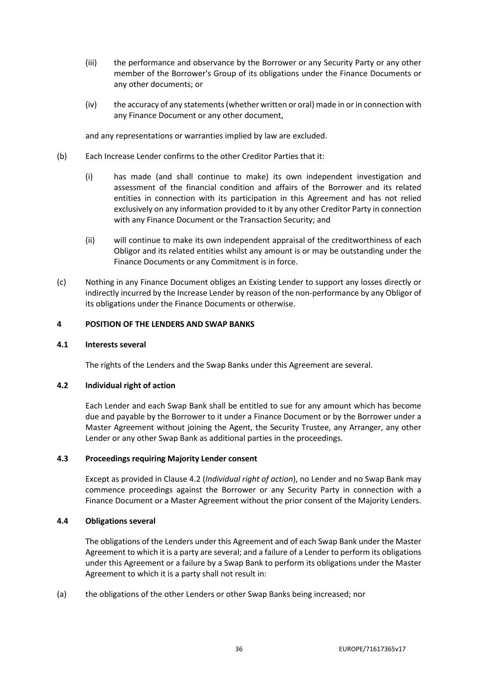 36 EUROPE/71617365v17 (iii) the performance and observance by the Borrower or any Security Party or any other member of the Borrower's Group of its obligations under the Finance Documents or any other documents; or (iv) the accuracy of any statements (whether written or oral) made in or in connection with any Finance Document or any other document, and any representations or warranties implied by law are excluded. (b) Each Increase Lender confirms to the other Creditor Parties that it: (i) has made (and shall continue to make) its own independent investigation and assessment of the financial condition and affairs of the Borrower and its related entities in connection with its participation in this Agreement and has not relied exclusively on any information provided to it by any other Creditor Party in connection with any Finance Document or the Transaction Security; and (ii) will continue to make its own independent appraisal of the creditworthiness of each Obligor and its related entities whilst any amount is or may be outstanding under the Finance Documents or any Commitment is in force. (c) Nothing in any Finance Document obliges an Existing Lender to support any losses directly or indirectly incurred by the Increase Lender by reason of the non-performance by any Obligor of its obligations under the Finance Documents or otherwise. 4 POSITION OF THE LENDERS AND SWAP BANKS 4.1 Interests several The rights of the Lenders and the Swap Banks under this Agreement are several. 4.2 Individual right of action Each Lender and each Swap Bank shall be entitled to sue for any amount which has become due and payable by the Borrower to it under a Finance Document or by the Borrower under a Master Agreement without joining the Agent, the Security Trustee, any Arranger, any other Lender or any other Swap Bank as additional parties in the proceedings. 4.3 Proceedings requiring Majority Lender consent Except as provided in Clause 4.2 (Individual right of action), no Lender and no Swap Bank may commence proceedings against the Borrower or any Security Party in connection with a Finance Document or a Master Agreement without the prior consent of the Majority Lenders. 4.4 Obligations several The obligations of the Lenders under this Agreement and of each Swap Bank under the Master Agreement to which it is a party are several; and a failure of a Lender to perform its obligations under this Agreement or a failure by a Swap Bank to perform its obligations under the Master Agreement to which it is a party shall not result in: (a) the obligations of the other Lenders or other Swap Banks being increased; nor