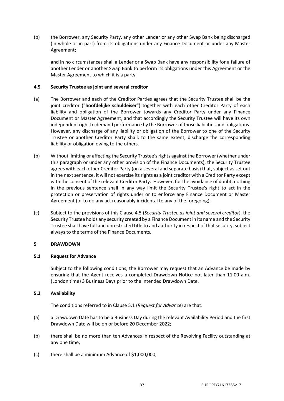 37 EUROPE/71617365v17 (b) the Borrower, any Security Party, any other Lender or any other Swap Bank being discharged (in whole or in part) from its obligations under any Finance Document or under any Master Agreement; and in no circumstances shall a Lender or a Swap Bank have any responsibility for a failure of another Lender or another Swap Bank to perform its obligations under this Agreement or the Master Agreement to which it is a party. 4.5 Security Trustee as joint and several creditor (a) The Borrower and each of the Creditor Parties agrees that the Security Trustee shall be the joint creditor ("hoofdelijke schuldeiser") together with each other Creditor Party of each liability and obligation of the Borrower towards any Creditor Party under any Finance Document or Master Agreement, and that accordingly the Security Trustee will have its own independent right to demand performance by the Borrower of those liabilities and obligations. However, any discharge of any liability or obligation of the Borrower to one of the Security Trustee or another Creditor Party shall, to the same extent, discharge the corresponding liability or obligation owing to the others. (b) Without limiting or affecting the Security Trustee's rights against the Borrower (whether under this paragraph or under any other provision of the Finance Documents), the Security Trustee agrees with each other Creditor Party (on a several and separate basis) that, subject as set out in the next sentence, it will not exercise its rights as a joint creditor with a Creditor Party except with the consent of the relevant Creditor Party. However, for the avoidance of doubt, nothing in the previous sentence shall in any way limit the Security Trustee's right to act in the protection or preservation of rights under or to enforce any Finance Document or Master Agreement (or to do any act reasonably incidental to any of the foregoing). (c) Subject to the provisions of this Clause 4.5 (Security Trustee as joint and several creditor), the Security Trustee holds any security created by a Finance Document in its name and the Security Trustee shall have full and unrestricted title to and authority in respect of that security, subject always to the terms of the Finance Documents. 5 DRAWDOWN 5.1 Request for Advance Subject to the following conditions, the Borrower may request that an Advance be made by ensuring that the Agent receives a completed Drawdown Notice not later than 11.00 a.m. (London time) 3 Business Days prior to the intended Drawdown Date. 5.2 Availability The conditions referred to in Clause 5.1 (Request for Advance) are that: (a) a Drawdown Date has to be a Business Day during the relevant Availability Period and the first Drawdown Date will be on or before 20 December 2022; (b) there shall be no more than ten Advances in respect of the Revolving Facility outstanding at any one time; (c) there shall be a minimum Advance of $1,000,000;