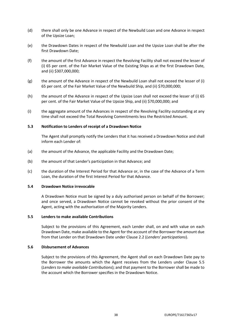 38 EUROPE/71617365v17 (d) there shall only be one Advance in respect of the Newbuild Loan and one Advance in respect of the Upsize Loan; (e) the Drawdown Dates in respect of the Newbuild Loan and the Upsize Loan shall be after the first Drawdown Date; (f) the amount of the first Advance in respect the Revolving Facility shall not exceed the lesser of (i) 65 per cent. of the Fair Market Value of the Existing Ships as at the first Drawdown Date, and (ii) $307,000,000; (g) the amount of the Advance in respect of the Newbuild Loan shall not exceed the lesser of (i) 65 per cent. of the Fair Market Value of the Newbuild Ship, and (ii) $70,000,000; (h) the amount of the Advance in respect of the Upsize Loan shall not exceed the lesser of (i) 65 per cent. of the Fair Market Value of the Upsize Ship, and (ii) $70,000,000; and (i) the aggregate amount of the Advances in respect of the Revolving Facility outstanding at any time shall not exceed the Total Revolving Commitments less the Restricted Amount. 5.3 Notification to Lenders of receipt of a Drawdown Notice The Agent shall promptly notify the Lenders that it has received a Drawdown Notice and shall inform each Lender of: (a) the amount of the Advance, the applicable Facility and the Drawdown Date; (b) the amount of that Lender's participation in that Advance; and (c) the duration of the Interest Period for that Advance or, in the case of the Advance of a Term Loan, the duration of the first Interest Period for that Advance. 5.4 Drawdown Notice irrevocable A Drawdown Notice must be signed by a duly authorised person on behalf of the Borrower; and once served, a Drawdown Notice cannot be revoked without the prior consent of the Agent, acting with the authorisation of the Majority Lenders. 5.5 Lenders to make available Contributions Subject to the provisions of this Agreement, each Lender shall, on and with value on each Drawdown Date, make available to the Agent for the account of the Borrower the amount due from that Lender on that Drawdown Date under Clause 2.2 (Lenders' participations). 5.6 Disbursement of Advances Subject to the provisions of this Agreement, the Agent shall on each Drawdown Date pay to the Borrower the amounts which the Agent receives from the Lenders under Clause 5.5 (Lenders to make available Contributions); and that payment to the Borrower shall be made to the account which the Borrower specifies in the Drawdown Notice.