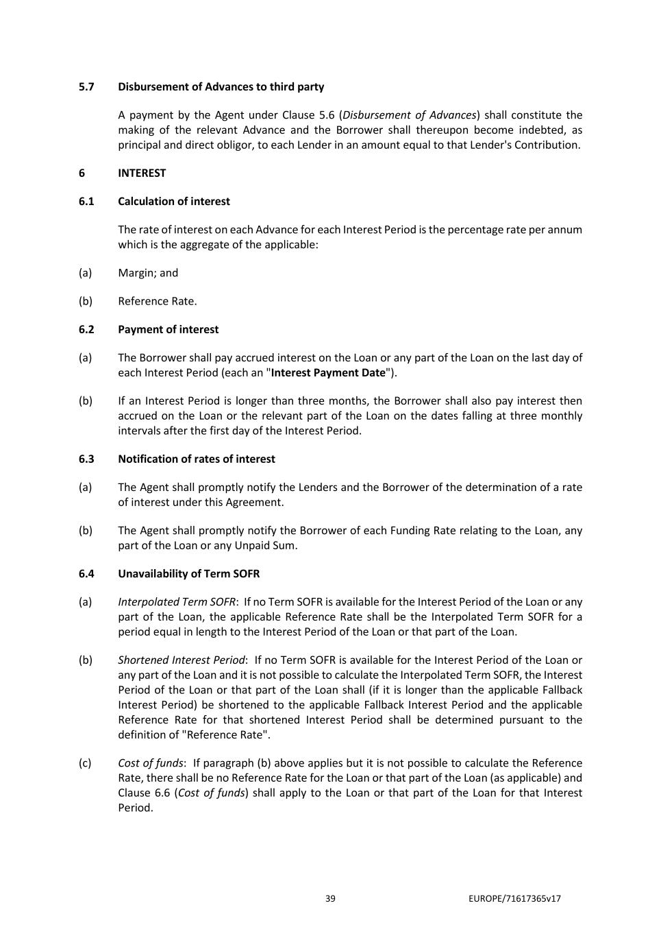 39 EUROPE/71617365v17 5.7 Disbursement of Advances to third party A payment by the Agent under Clause 5.6 (Disbursement of Advances) shall constitute the making of the relevant Advance and the Borrower shall thereupon become indebted, as principal and direct obligor, to each Lender in an amount equal to that Lender's Contribution. 6 INTEREST 6.1 Calculation of interest The rate of interest on each Advance for each Interest Period is the percentage rate per annum which is the aggregate of the applicable: (a) Margin; and (b) Reference Rate. 6.2 Payment of interest (a) The Borrower shall pay accrued interest on the Loan or any part of the Loan on the last day of each Interest Period (each an "Interest Payment Date"). (b) If an Interest Period is longer than three months, the Borrower shall also pay interest then accrued on the Loan or the relevant part of the Loan on the dates falling at three monthly intervals after the first day of the Interest Period. 6.3 Notification of rates of interest (a) The Agent shall promptly notify the Lenders and the Borrower of the determination of a rate of interest under this Agreement. (b) The Agent shall promptly notify the Borrower of each Funding Rate relating to the Loan, any part of the Loan or any Unpaid Sum. 6.4 Unavailability of Term SOFR (a) Interpolated Term SOFR: If no Term SOFR is available for the Interest Period of the Loan or any part of the Loan, the applicable Reference Rate shall be the Interpolated Term SOFR for a period equal in length to the Interest Period of the Loan or that part of the Loan. (b) Shortened Interest Period: If no Term SOFR is available for the Interest Period of the Loan or any part of the Loan and it is not possible to calculate the Interpolated Term SOFR, the Interest Period of the Loan or that part of the Loan shall (if it is longer than the applicable Fallback Interest Period) be shortened to the applicable Fallback Interest Period and the applicable Reference Rate for that shortened Interest Period shall be determined pursuant to the definition of "Reference Rate". (c) Cost of funds: If paragraph (b) above applies but it is not possible to calculate the Reference Rate, there shall be no Reference Rate for the Loan or that part of the Loan (as applicable) and Clause 6.6 (Cost of funds) shall apply to the Loan or that part of the Loan for that Interest Period.