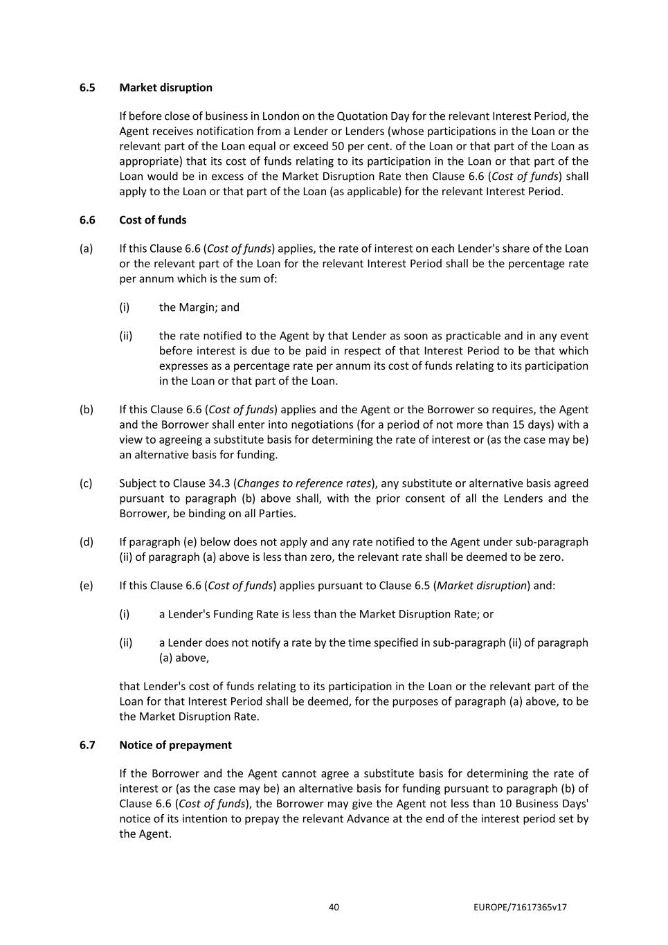 40 EUROPE/71617365v17 6.5 Market disruption If before close of business in London on the Quotation Day for the relevant Interest Period, the Agent receives notification from a Lender or Lenders (whose participations in the Loan or the relevant part of the Loan equal or exceed 50 per cent. of the Loan or that part of the Loan as appropriate) that its cost of funds relating to its participation in the Loan or that part of the Loan would be in excess of the Market Disruption Rate then Clause 6.6 (Cost of funds) shall apply to the Loan or that part of the Loan (as applicable) for the relevant Interest Period. 6.6 Cost of funds (a) If this Clause 6.6 (Cost of funds) applies, the rate of interest on each Lender's share of the Loan or the relevant part of the Loan for the relevant Interest Period shall be the percentage rate per annum which is the sum of: (i) the Margin; and (ii) the rate notified to the Agent by that Lender as soon as practicable and in any event before interest is due to be paid in respect of that Interest Period to be that which expresses as a percentage rate per annum its cost of funds relating to its participation in the Loan or that part of the Loan. (b) If this Clause 6.6 (Cost of funds) applies and the Agent or the Borrower so requires, the Agent and the Borrower shall enter into negotiations (for a period of not more than 15 days) with a view to agreeing a substitute basis for determining the rate of interest or (as the case may be) an alternative basis for funding. (c) Subject to Clause 34.3 (Changes to reference rates), any substitute or alternative basis agreed pursuant to paragraph (b) above shall, with the prior consent of all the Lenders and the Borrower, be binding on all Parties. (d) If paragraph (e) below does not apply and any rate notified to the Agent under sub-paragraph (ii) of paragraph (a) above is less than zero, the relevant rate shall be deemed to be zero. (e) If this Clause 6.6 (Cost of funds) applies pursuant to Clause 6.5 (Market disruption) and: (i) a Lender's Funding Rate is less than the Market Disruption Rate; or (ii) a Lender does not notify a rate by the time specified in sub-paragraph (ii) of paragraph (a) above, that Lender's cost of funds relating to its participation in the Loan or the relevant part of the Loan for that Interest Period shall be deemed, for the purposes of paragraph (a) above, to be the Market Disruption Rate. 6.7 Notice of prepayment If the Borrower and the Agent cannot agree a substitute basis for determining the rate of interest or (as the case may be) an alternative basis for funding pursuant to paragraph (b) of Clause 6.6 (Cost of funds), the Borrower may give the Agent not less than 10 Business Days' notice of its intention to prepay the relevant Advance at the end of the interest period set by the Agent.