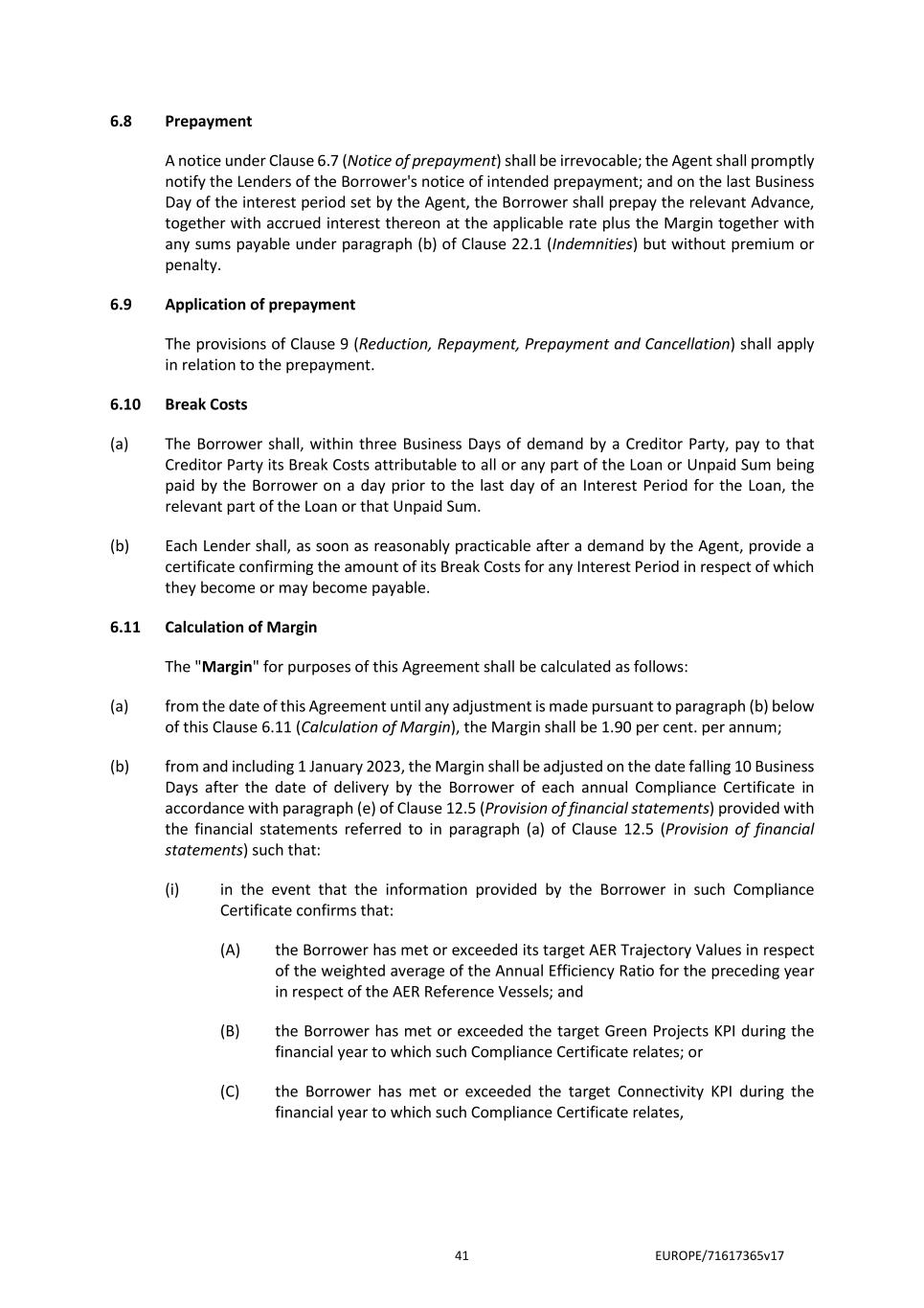 41 EUROPE/71617365v17 6.8 Prepayment A notice under Clause 6.7 (Notice of prepayment) shall be irrevocable; the Agent shall promptly notify the Lenders of the Borrower's notice of intended prepayment; and on the last Business Day of the interest period set by the Agent, the Borrower shall prepay the relevant Advance, together with accrued interest thereon at the applicable rate plus the Margin together with any sums payable under paragraph (b) of Clause 22.1 (Indemnities) but without premium or penalty. 6.9 Application of prepayment The provisions of Clause 9 (Reduction, Repayment, Prepayment and Cancellation) shall apply in relation to the prepayment. 6.10 Break Costs (a) The Borrower shall, within three Business Days of demand by a Creditor Party, pay to that Creditor Party its Break Costs attributable to all or any part of the Loan or Unpaid Sum being paid by the Borrower on a day prior to the last day of an Interest Period for the Loan, the relevant part of the Loan or that Unpaid Sum. (b) Each Lender shall, as soon as reasonably practicable after a demand by the Agent, provide a certificate confirming the amount of its Break Costs for any Interest Period in respect of which they become or may become payable. 6.11 Calculation of Margin The "Margin" for purposes of this Agreement shall be calculated as follows: (a) from the date of this Agreement until any adjustment is made pursuant to paragraph (b) below of this Clause 6.11 (Calculation of Margin), the Margin shall be 1.90 per cent. per annum; (b) from and including 1 January 2023, the Margin shall be adjusted on the date falling 10 Business Days after the date of delivery by the Borrower of each annual Compliance Certificate in accordance with paragraph (e) of Clause 12.5 (Provision of financial statements) provided with the financial statements referred to in paragraph (a) of Clause 12.5 (Provision of financial statements) such that: (i) in the event that the information provided by the Borrower in such Compliance Certificate confirms that: (A) the Borrower has met or exceeded its target AER Trajectory Values in respect of the weighted average of the Annual Efficiency Ratio for the preceding year in respect of the AER Reference Vessels; and (B) the Borrower has met or exceeded the target Green Projects KPI during the financial year to which such Compliance Certificate relates; or (C) the Borrower has met or exceeded the target Connectivity KPI during the financial year to which such Compliance Certificate relates,