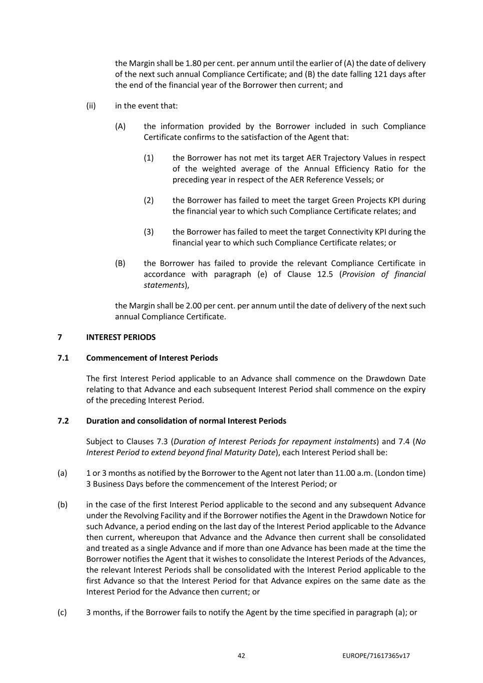 42 EUROPE/71617365v17 the Margin shall be 1.80 per cent. per annum until the earlier of (A) the date of delivery of the next such annual Compliance Certificate; and (B) the date falling 121 days after the end of the financial year of the Borrower then current; and (ii) in the event that: (A) the information provided by the Borrower included in such Compliance Certificate confirms to the satisfaction of the Agent that: (1) the Borrower has not met its target AER Trajectory Values in respect of the weighted average of the Annual Efficiency Ratio for the preceding year in respect of the AER Reference Vessels; or (2) the Borrower has failed to meet the target Green Projects KPI during the financial year to which such Compliance Certificate relates; and (3) the Borrower has failed to meet the target Connectivity KPI during the financial year to which such Compliance Certificate relates; or (B) the Borrower has failed to provide the relevant Compliance Certificate in accordance with paragraph (e) of Clause 12.5 (Provision of financial statements), the Margin shall be 2.00 per cent. per annum until the date of delivery of the next such annual Compliance Certificate. 7 INTEREST PERIODS 7.1 Commencement of Interest Periods The first Interest Period applicable to an Advance shall commence on the Drawdown Date relating to that Advance and each subsequent Interest Period shall commence on the expiry of the preceding Interest Period. 7.2 Duration and consolidation of normal Interest Periods Subject to Clauses 7.3 (Duration of Interest Periods for repayment instalments) and 7.4 (No Interest Period to extend beyond final Maturity Date), each Interest Period shall be: (a) 1 or 3 months as notified by the Borrower to the Agent not later than 11.00 a.m. (London time) 3 Business Days before the commencement of the Interest Period; or (b) in the case of the first Interest Period applicable to the second and any subsequent Advance under the Revolving Facility and if the Borrower notifies the Agent in the Drawdown Notice for such Advance, a period ending on the last day of the Interest Period applicable to the Advance then current, whereupon that Advance and the Advance then current shall be consolidated and treated as a single Advance and if more than one Advance has been made at the time the Borrower notifies the Agent that it wishes to consolidate the Interest Periods of the Advances, the relevant Interest Periods shall be consolidated with the Interest Period applicable to the first Advance so that the Interest Period for that Advance expires on the same date as the Interest Period for the Advance then current; or (c) 3 months, if the Borrower fails to notify the Agent by the time specified in paragraph (a); or