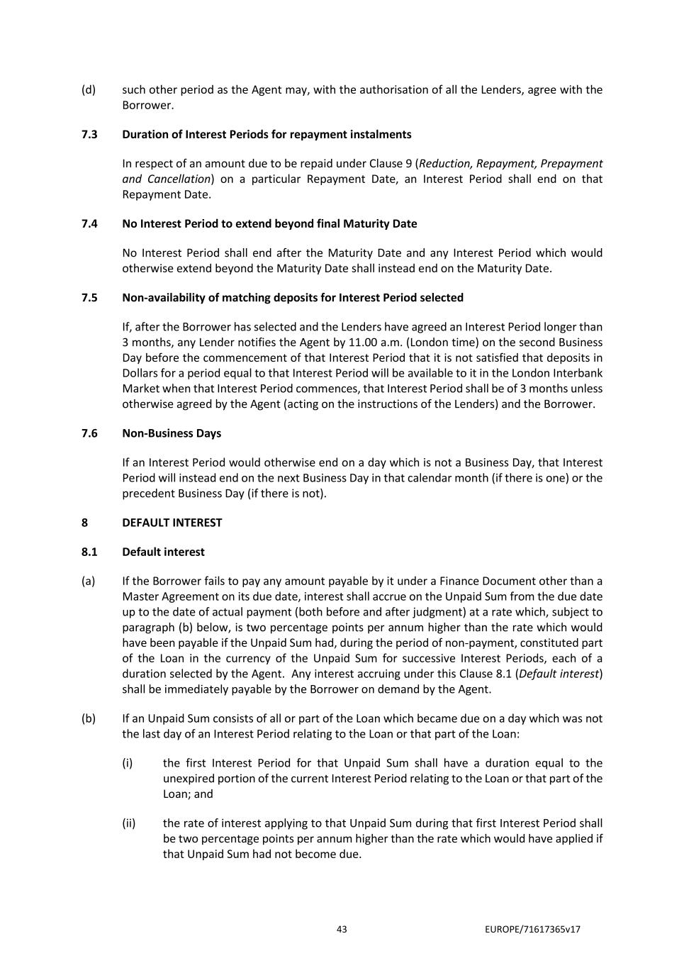 43 EUROPE/71617365v17 (d) such other period as the Agent may, with the authorisation of all the Lenders, agree with the Borrower. 7.3 Duration of Interest Periods for repayment instalments In respect of an amount due to be repaid under Clause 9 (Reduction, Repayment, Prepayment and Cancellation) on a particular Repayment Date, an Interest Period shall end on that Repayment Date. 7.4 No Interest Period to extend beyond final Maturity Date No Interest Period shall end after the Maturity Date and any Interest Period which would otherwise extend beyond the Maturity Date shall instead end on the Maturity Date. 7.5 Non-availability of matching deposits for Interest Period selected If, after the Borrower has selected and the Lenders have agreed an Interest Period longer than 3 months, any Lender notifies the Agent by 11.00 a.m. (London time) on the second Business Day before the commencement of that Interest Period that it is not satisfied that deposits in Dollars for a period equal to that Interest Period will be available to it in the London Interbank Market when that Interest Period commences, that Interest Period shall be of 3 months unless otherwise agreed by the Agent (acting on the instructions of the Lenders) and the Borrower. 7.6 Non-Business Days If an Interest Period would otherwise end on a day which is not a Business Day, that Interest Period will instead end on the next Business Day in that calendar month (if there is one) or the precedent Business Day (if there is not). 8 DEFAULT INTEREST 8.1 Default interest (a) If the Borrower fails to pay any amount payable by it under a Finance Document other than a Master Agreement on its due date, interest shall accrue on the Unpaid Sum from the due date up to the date of actual payment (both before and after judgment) at a rate which, subject to paragraph (b) below, is two percentage points per annum higher than the rate which would have been payable if the Unpaid Sum had, during the period of non-payment, constituted part of the Loan in the currency of the Unpaid Sum for successive Interest Periods, each of a duration selected by the Agent. Any interest accruing under this Clause 8.1 (Default interest) shall be immediately payable by the Borrower on demand by the Agent. (b) If an Unpaid Sum consists of all or part of the Loan which became due on a day which was not the last day of an Interest Period relating to the Loan or that part of the Loan: (i) the first Interest Period for that Unpaid Sum shall have a duration equal to the unexpired portion of the current Interest Period relating to the Loan or that part of the Loan; and (ii) the rate of interest applying to that Unpaid Sum during that first Interest Period shall be two percentage points per annum higher than the rate which would have applied if that Unpaid Sum had not become due.