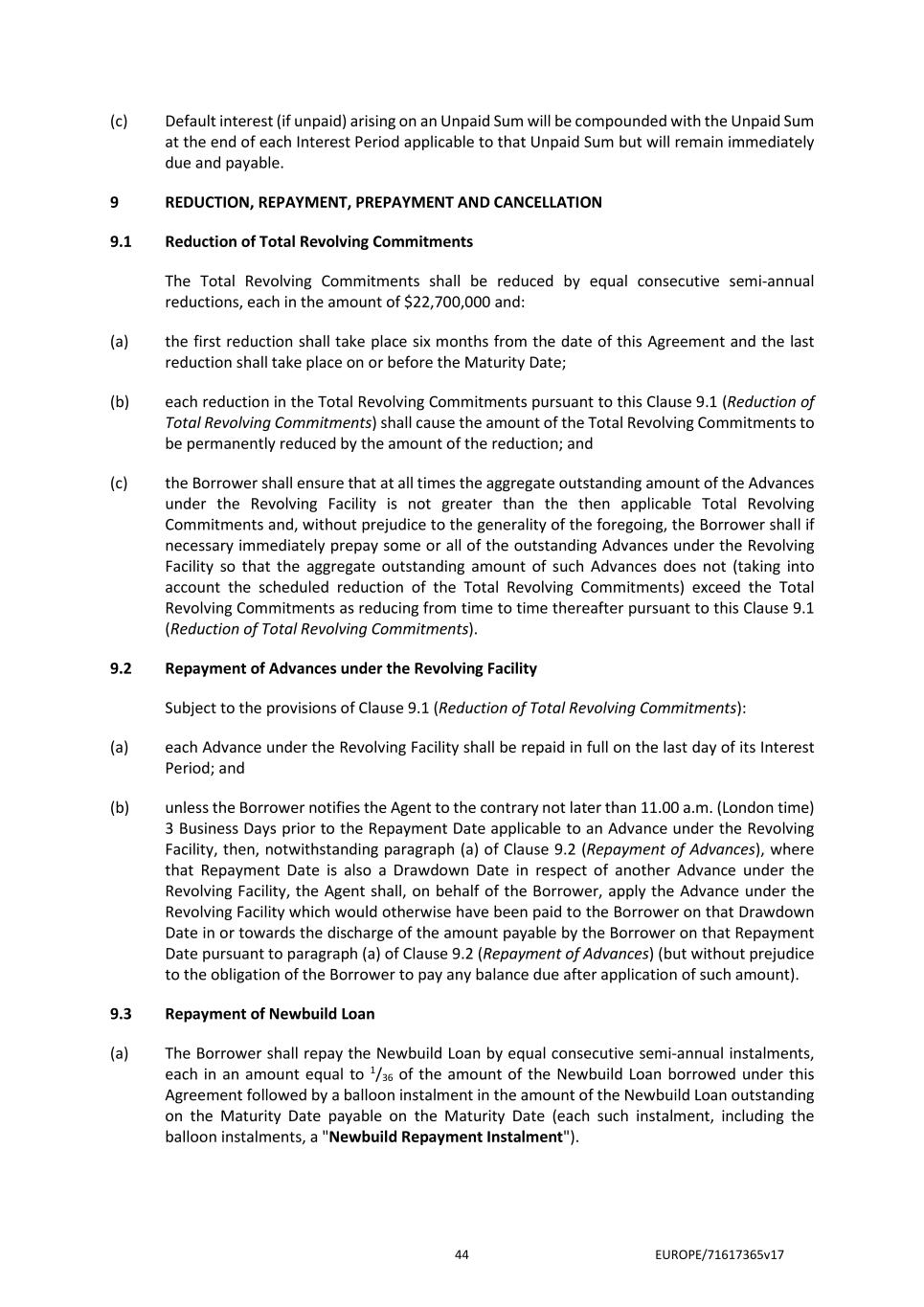 44 EUROPE/71617365v17 (c) Default interest (if unpaid) arising on an Unpaid Sum will be compounded with the Unpaid Sum at the end of each Interest Period applicable to that Unpaid Sum but will remain immediately due and payable. 9 REDUCTION, REPAYMENT, PREPAYMENT AND CANCELLATION 9.1 Reduction of Total Revolving Commitments The Total Revolving Commitments shall be reduced by equal consecutive semi-annual reductions, each in the amount of $22,700,000 and: (a) the first reduction shall take place six months from the date of this Agreement and the last reduction shall take place on or before the Maturity Date; (b) each reduction in the Total Revolving Commitments pursuant to this Clause 9.1 (Reduction of Total Revolving Commitments) shall cause the amount of the Total Revolving Commitments to be permanently reduced by the amount of the reduction; and (c) the Borrower shall ensure that at all times the aggregate outstanding amount of the Advances under the Revolving Facility is not greater than the then applicable Total Revolving Commitments and, without prejudice to the generality of the foregoing, the Borrower shall if necessary immediately prepay some or all of the outstanding Advances under the Revolving Facility so that the aggregate outstanding amount of such Advances does not (taking into account the scheduled reduction of the Total Revolving Commitments) exceed the Total Revolving Commitments as reducing from time to time thereafter pursuant to this Clause 9.1 (Reduction of Total Revolving Commitments). 9.2 Repayment of Advances under the Revolving Facility Subject to the provisions of Clause 9.1 (Reduction of Total Revolving Commitments): (a) each Advance under the Revolving Facility shall be repaid in full on the last day of its Interest Period; and (b) unless the Borrower notifies the Agent to the contrary not later than 11.00 a.m. (London time) 3 Business Days prior to the Repayment Date applicable to an Advance under the Revolving Facility, then, notwithstanding paragraph (a) of Clause 9.2 (Repayment of Advances), where that Repayment Date is also a Drawdown Date in respect of another Advance under the Revolving Facility, the Agent shall, on behalf of the Borrower, apply the Advance under the Revolving Facility which would otherwise have been paid to the Borrower on that Drawdown Date in or towards the discharge of the amount payable by the Borrower on that Repayment Date pursuant to paragraph (a) of Clause 9.2 (Repayment of Advances) (but without prejudice to the obligation of the Borrower to pay any balance due after application of such amount). 9.3 Repayment of Newbuild Loan (a) The Borrower shall repay the Newbuild Loan by equal consecutive semi-annual instalments, each in an amount equal to 1/36 of the amount of the Newbuild Loan borrowed under this Agreement followed by a balloon instalment in the amount of the Newbuild Loan outstanding on the Maturity Date payable on the Maturity Date (each such instalment, including the balloon instalments, a "Newbuild Repayment Instalment").