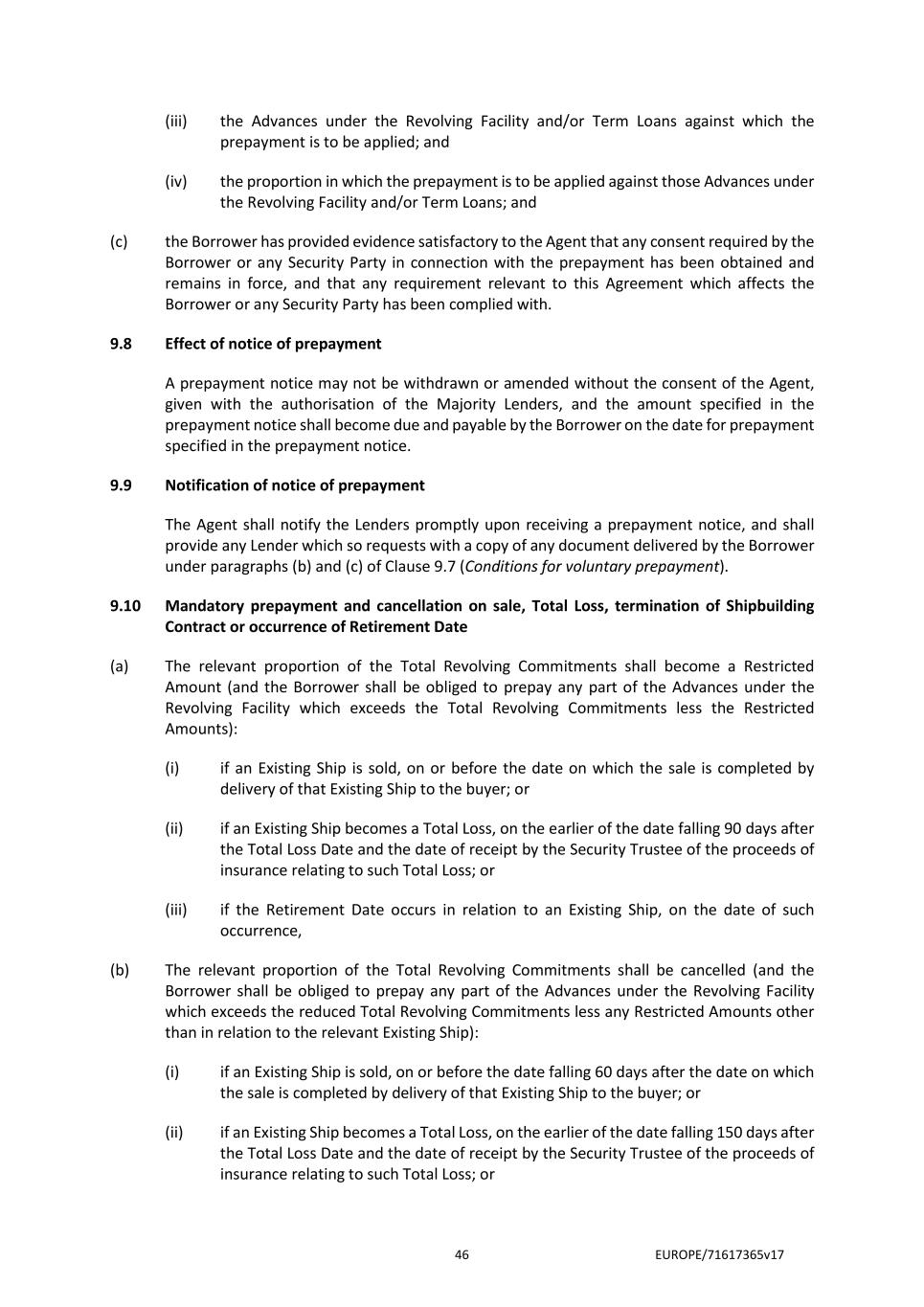 46 EUROPE/71617365v17 (iii) the Advances under the Revolving Facility and/or Term Loans against which the prepayment is to be applied; and (iv) the proportion in which the prepayment is to be applied against those Advances under the Revolving Facility and/or Term Loans; and (c) the Borrower has provided evidence satisfactory to the Agent that any consent required by the Borrower or any Security Party in connection with the prepayment has been obtained and remains in force, and that any requirement relevant to this Agreement which affects the Borrower or any Security Party has been complied with. 9.8 Effect of notice of prepayment A prepayment notice may not be withdrawn or amended without the consent of the Agent, given with the authorisation of the Majority Lenders, and the amount specified in the prepayment notice shall become due and payable by the Borrower on the date for prepayment specified in the prepayment notice. 9.9 Notification of notice of prepayment The Agent shall notify the Lenders promptly upon receiving a prepayment notice, and shall provide any Lender which so requests with a copy of any document delivered by the Borrower under paragraphs (b) and (c) of Clause 9.7 (Conditions for voluntary prepayment). 9.10 Mandatory prepayment and cancellation on sale, Total Loss, termination of Shipbuilding Contract or occurrence of Retirement Date (a) The relevant proportion of the Total Revolving Commitments shall become a Restricted Amount (and the Borrower shall be obliged to prepay any part of the Advances under the Revolving Facility which exceeds the Total Revolving Commitments less the Restricted Amounts): (i) if an Existing Ship is sold, on or before the date on which the sale is completed by delivery of that Existing Ship to the buyer; or (ii) if an Existing Ship becomes a Total Loss, on the earlier of the date falling 90 days after the Total Loss Date and the date of receipt by the Security Trustee of the proceeds of insurance relating to such Total Loss; or (iii) if the Retirement Date occurs in relation to an Existing Ship, on the date of such occurrence, (b) The relevant proportion of the Total Revolving Commitments shall be cancelled (and the Borrower shall be obliged to prepay any part of the Advances under the Revolving Facility which exceeds the reduced Total Revolving Commitments less any Restricted Amounts other than in relation to the relevant Existing Ship): (i) if an Existing Ship is sold, on or before the date falling 60 days after the date on which the sale is completed by delivery of that Existing Ship to the buyer; or (ii) if an Existing Ship becomes a Total Loss, on the earlier of the date falling 150 days after the Total Loss Date and the date of receipt by the Security Trustee of the proceeds of insurance relating to such Total Loss; or