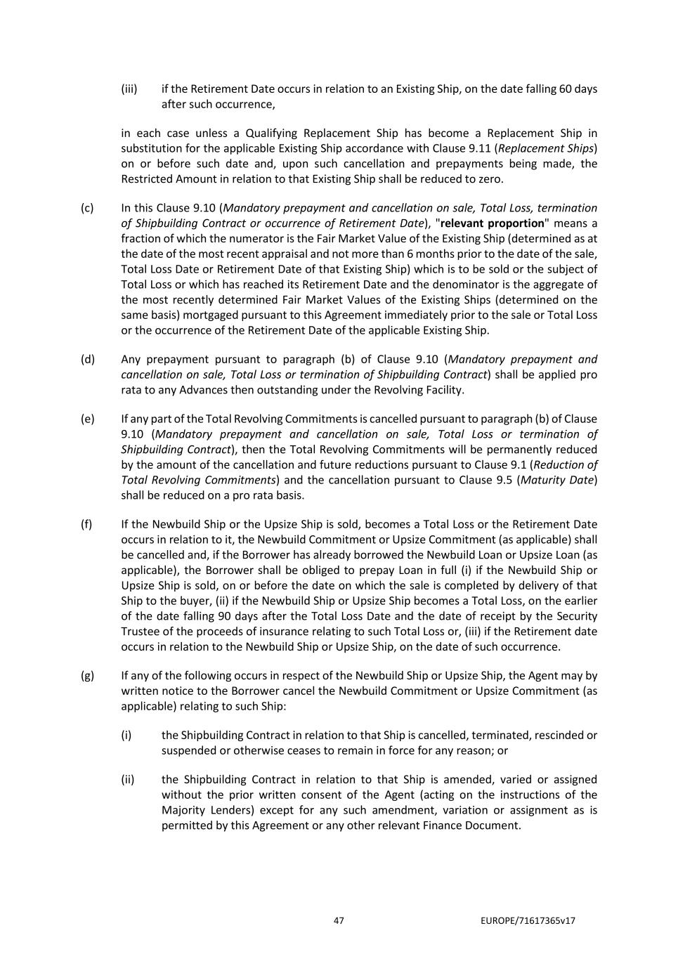 47 EUROPE/71617365v17 (iii) if the Retirement Date occurs in relation to an Existing Ship, on the date falling 60 days after such occurrence, in each case unless a Qualifying Replacement Ship has become a Replacement Ship in substitution for the applicable Existing Ship accordance with Clause 9.11 (Replacement Ships) on or before such date and, upon such cancellation and prepayments being made, the Restricted Amount in relation to that Existing Ship shall be reduced to zero. (c) In this Clause 9.10 (Mandatory prepayment and cancellation on sale, Total Loss, termination of Shipbuilding Contract or occurrence of Retirement Date), "relevant proportion" means a fraction of which the numerator is the Fair Market Value of the Existing Ship (determined as at the date of the most recent appraisal and not more than 6 months prior to the date of the sale, Total Loss Date or Retirement Date of that Existing Ship) which is to be sold or the subject of Total Loss or which has reached its Retirement Date and the denominator is the aggregate of the most recently determined Fair Market Values of the Existing Ships (determined on the same basis) mortgaged pursuant to this Agreement immediately prior to the sale or Total Loss or the occurrence of the Retirement Date of the applicable Existing Ship. (d) Any prepayment pursuant to paragraph (b) of Clause 9.10 (Mandatory prepayment and cancellation on sale, Total Loss or termination of Shipbuilding Contract) shall be applied pro rata to any Advances then outstanding under the Revolving Facility. (e) If any part of the Total Revolving Commitments is cancelled pursuant to paragraph (b) of Clause 9.10 (Mandatory prepayment and cancellation on sale, Total Loss or termination of Shipbuilding Contract), then the Total Revolving Commitments will be permanently reduced by the amount of the cancellation and future reductions pursuant to Clause 9.1 (Reduction of Total Revolving Commitments) and the cancellation pursuant to Clause 9.5 (Maturity Date) shall be reduced on a pro rata basis. (f) If the Newbuild Ship or the Upsize Ship is sold, becomes a Total Loss or the Retirement Date occurs in relation to it, the Newbuild Commitment or Upsize Commitment (as applicable) shall be cancelled and, if the Borrower has already borrowed the Newbuild Loan or Upsize Loan (as applicable), the Borrower shall be obliged to prepay Loan in full (i) if the Newbuild Ship or Upsize Ship is sold, on or before the date on which the sale is completed by delivery of that Ship to the buyer, (ii) if the Newbuild Ship or Upsize Ship becomes a Total Loss, on the earlier of the date falling 90 days after the Total Loss Date and the date of receipt by the Security Trustee of the proceeds of insurance relating to such Total Loss or, (iii) if the Retirement date occurs in relation to the Newbuild Ship or Upsize Ship, on the date of such occurrence. (g) If any of the following occurs in respect of the Newbuild Ship or Upsize Ship, the Agent may by written notice to the Borrower cancel the Newbuild Commitment or Upsize Commitment (as applicable) relating to such Ship: (i) the Shipbuilding Contract in relation to that Ship is cancelled, terminated, rescinded or suspended or otherwise ceases to remain in force for any reason; or (ii) the Shipbuilding Contract in relation to that Ship is amended, varied or assigned without the prior written consent of the Agent (acting on the instructions of the Majority Lenders) except for any such amendment, variation or assignment as is permitted by this Agreement or any other relevant Finance Document.