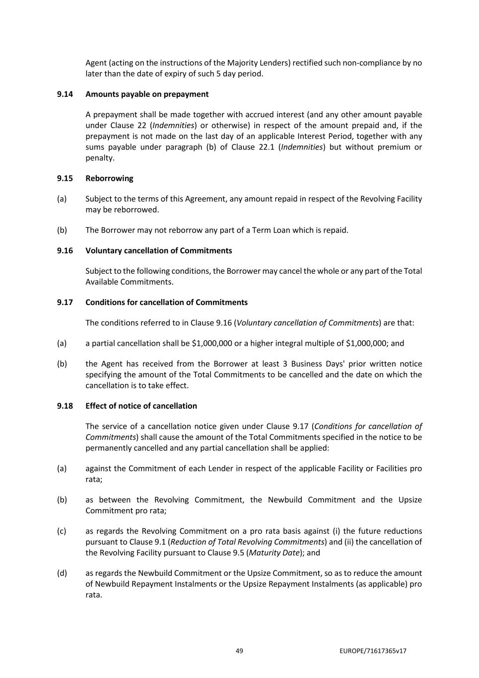 49 EUROPE/71617365v17 Agent (acting on the instructions of the Majority Lenders) rectified such non-compliance by no later than the date of expiry of such 5 day period. 9.14 Amounts payable on prepayment A prepayment shall be made together with accrued interest (and any other amount payable under Clause 22 (Indemnities) or otherwise) in respect of the amount prepaid and, if the prepayment is not made on the last day of an applicable Interest Period, together with any sums payable under paragraph (b) of Clause 22.1 (Indemnities) but without premium or penalty. 9.15 Reborrowing (a) Subject to the terms of this Agreement, any amount repaid in respect of the Revolving Facility may be reborrowed. (b) The Borrower may not reborrow any part of a Term Loan which is repaid. 9.16 Voluntary cancellation of Commitments Subject to the following conditions, the Borrower may cancel the whole or any part of the Total Available Commitments. 9.17 Conditions for cancellation of Commitments The conditions referred to in Clause 9.16 (Voluntary cancellation of Commitments) are that: (a) a partial cancellation shall be $1,000,000 or a higher integral multiple of $1,000,000; and (b) the Agent has received from the Borrower at least 3 Business Days' prior written notice specifying the amount of the Total Commitments to be cancelled and the date on which the cancellation is to take effect. 9.18 Effect of notice of cancellation The service of a cancellation notice given under Clause 9.17 (Conditions for cancellation of Commitments) shall cause the amount of the Total Commitments specified in the notice to be permanently cancelled and any partial cancellation shall be applied: (a) against the Commitment of each Lender in respect of the applicable Facility or Facilities pro rata; (b) as between the Revolving Commitment, the Newbuild Commitment and the Upsize Commitment pro rata; (c) as regards the Revolving Commitment on a pro rata basis against (i) the future reductions pursuant to Clause 9.1 (Reduction of Total Revolving Commitments) and (ii) the cancellation of the Revolving Facility pursuant to Clause 9.5 (Maturity Date); and (d) as regards the Newbuild Commitment or the Upsize Commitment, so as to reduce the amount of Newbuild Repayment Instalments or the Upsize Repayment Instalments (as applicable) pro rata.