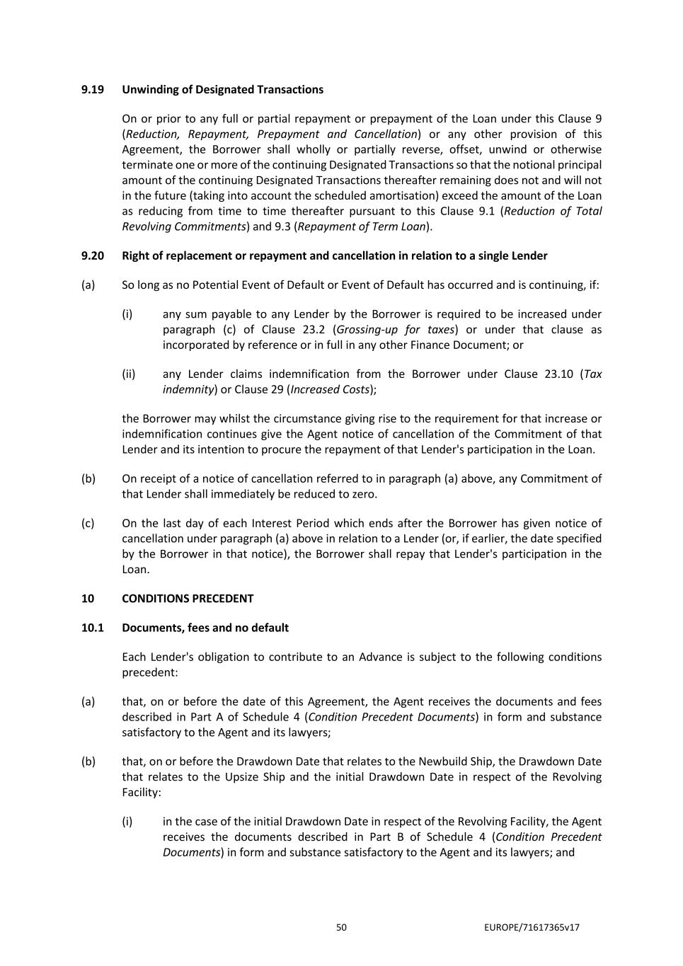 50 EUROPE/71617365v17 9.19 Unwinding of Designated Transactions On or prior to any full or partial repayment or prepayment of the Loan under this Clause 9 (Reduction, Repayment, Prepayment and Cancellation) or any other provision of this Agreement, the Borrower shall wholly or partially reverse, offset, unwind or otherwise terminate one or more of the continuing Designated Transactions so that the notional principal amount of the continuing Designated Transactions thereafter remaining does not and will not in the future (taking into account the scheduled amortisation) exceed the amount of the Loan as reducing from time to time thereafter pursuant to this Clause 9.1 (Reduction of Total Revolving Commitments) and 9.3 (Repayment of Term Loan). 9.20 Right of replacement or repayment and cancellation in relation to a single Lender (a) So long as no Potential Event of Default or Event of Default has occurred and is continuing, if: (i) any sum payable to any Lender by the Borrower is required to be increased under paragraph (c) of Clause 23.2 (Grossing-up for taxes) or under that clause as incorporated by reference or in full in any other Finance Document; or (ii) any Lender claims indemnification from the Borrower under Clause 23.10 (Tax indemnity) or Clause 29 (Increased Costs); the Borrower may whilst the circumstance giving rise to the requirement for that increase or indemnification continues give the Agent notice of cancellation of the Commitment of that Lender and its intention to procure the repayment of that Lender's participation in the Loan. (b) On receipt of a notice of cancellation referred to in paragraph (a) above, any Commitment of that Lender shall immediately be reduced to zero. (c) On the last day of each Interest Period which ends after the Borrower has given notice of cancellation under paragraph (a) above in relation to a Lender (or, if earlier, the date specified by the Borrower in that notice), the Borrower shall repay that Lender's participation in the Loan. 10 CONDITIONS PRECEDENT 10.1 Documents, fees and no default Each Lender's obligation to contribute to an Advance is subject to the following conditions precedent: (a) that, on or before the date of this Agreement, the Agent receives the documents and fees described in Part A of Schedule 4 (Condition Precedent Documents) in form and substance satisfactory to the Agent and its lawyers; (b) that, on or before the Drawdown Date that relates to the Newbuild Ship, the Drawdown Date that relates to the Upsize Ship and the initial Drawdown Date in respect of the Revolving Facility: (i) in the case of the initial Drawdown Date in respect of the Revolving Facility, the Agent receives the documents described in Part B of Schedule 4 (Condition Precedent Documents) in form and substance satisfactory to the Agent and its lawyers; and