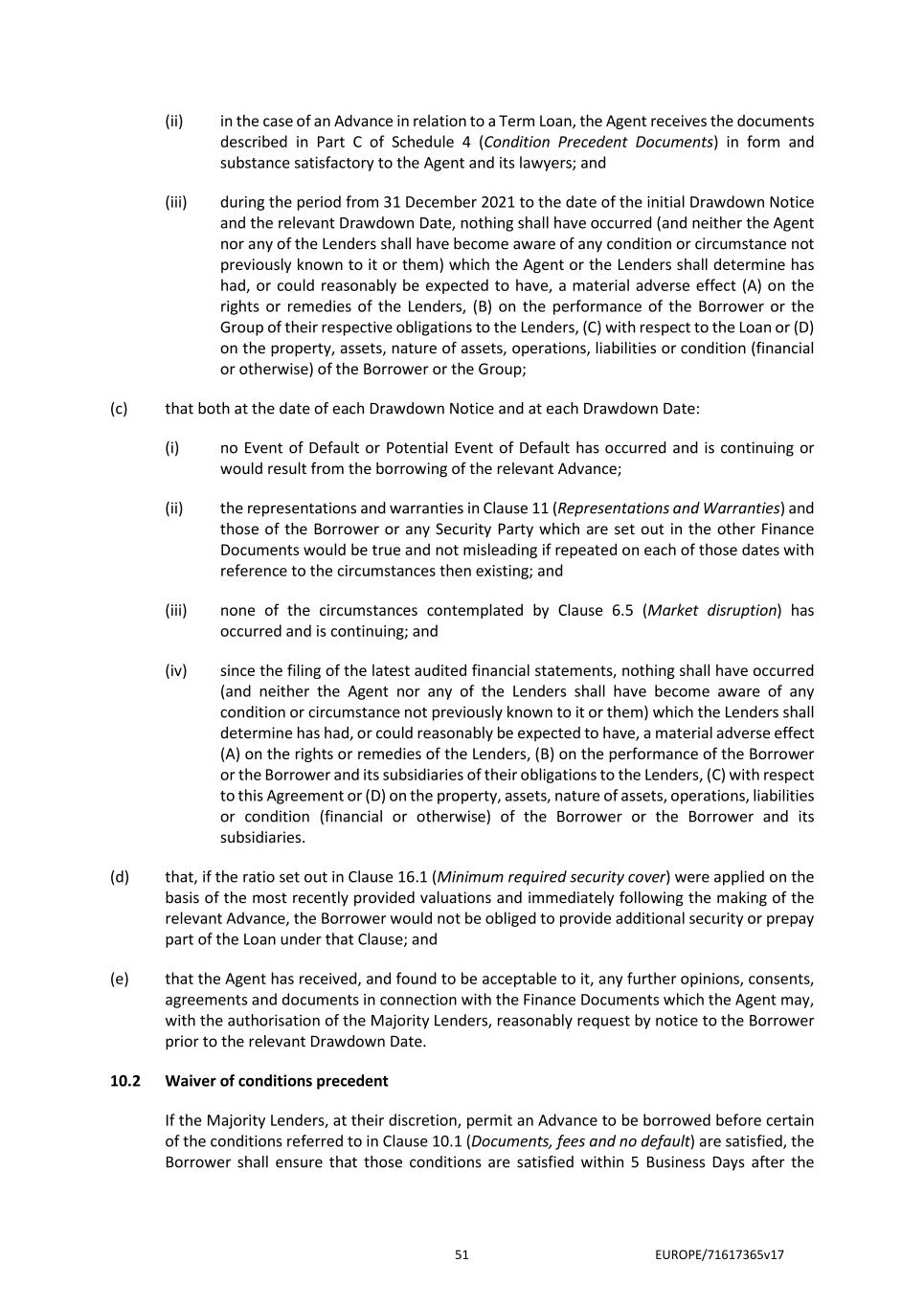 51 EUROPE/71617365v17 (ii) in the case of an Advance in relation to a Term Loan, the Agent receives the documents described in Part C of Schedule 4 (Condition Precedent Documents) in form and substance satisfactory to the Agent and its lawyers; and (iii) during the period from 31 December 2021 to the date of the initial Drawdown Notice and the relevant Drawdown Date, nothing shall have occurred (and neither the Agent nor any of the Lenders shall have become aware of any condition or circumstance not previously known to it or them) which the Agent or the Lenders shall determine has had, or could reasonably be expected to have, a material adverse effect (A) on the rights or remedies of the Lenders, (B) on the performance of the Borrower or the Group of their respective obligations to the Lenders, (C) with respect to the Loan or (D) on the property, assets, nature of assets, operations, liabilities or condition (financial or otherwise) of the Borrower or the Group; (c) that both at the date of each Drawdown Notice and at each Drawdown Date: (i) no Event of Default or Potential Event of Default has occurred and is continuing or would result from the borrowing of the relevant Advance; (ii) the representations and warranties in Clause 11 (Representations and Warranties) and those of the Borrower or any Security Party which are set out in the other Finance Documents would be true and not misleading if repeated on each of those dates with reference to the circumstances then existing; and (iii) none of the circumstances contemplated by Clause 6.5 (Market disruption) has occurred and is continuing; and (iv) since the filing of the latest audited financial statements, nothing shall have occurred (and neither the Agent nor any of the Lenders shall have become aware of any condition or circumstance not previously known to it or them) which the Lenders shall determine has had, or could reasonably be expected to have, a material adverse effect (A) on the rights or remedies of the Lenders, (B) on the performance of the Borrower or the Borrower and its subsidiaries of their obligations to the Lenders, (C) with respect to this Agreement or (D) on the property, assets, nature of assets, operations, liabilities or condition (financial or otherwise) of the Borrower or the Borrower and its subsidiaries. (d) that, if the ratio set out in Clause 16.1 (Minimum required security cover) were applied on the basis of the most recently provided valuations and immediately following the making of the relevant Advance, the Borrower would not be obliged to provide additional security or prepay part of the Loan under that Clause; and (e) that the Agent has received, and found to be acceptable to it, any further opinions, consents, agreements and documents in connection with the Finance Documents which the Agent may, with the authorisation of the Majority Lenders, reasonably request by notice to the Borrower prior to the relevant Drawdown Date. 10.2 Waiver of conditions precedent If the Majority Lenders, at their discretion, permit an Advance to be borrowed before certain of the conditions referred to in Clause 10.1 (Documents, fees and no default) are satisfied, the Borrower shall ensure that those conditions are satisfied within 5 Business Days after the