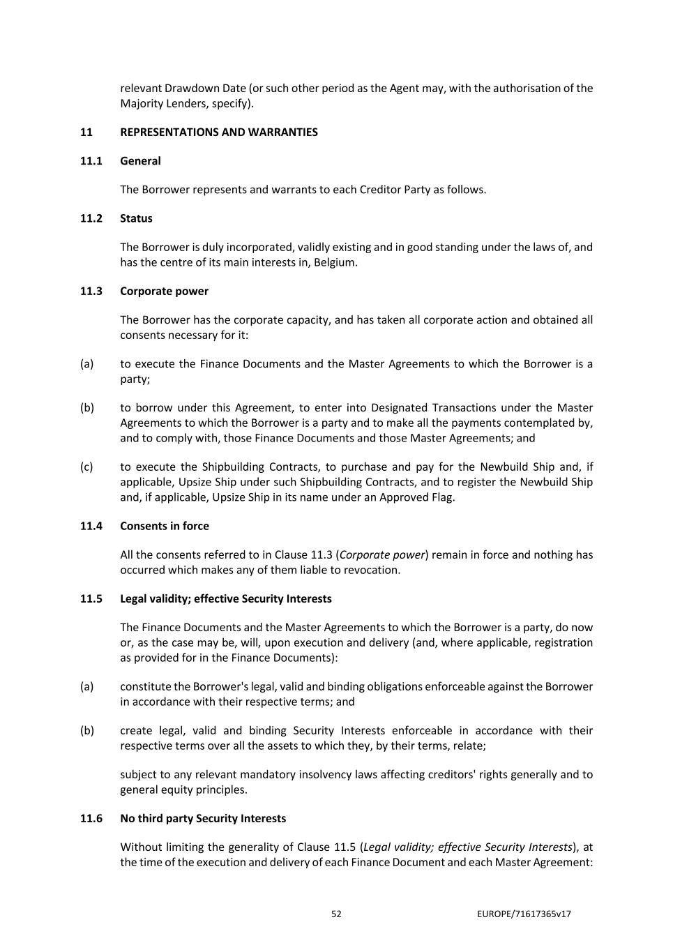 52 EUROPE/71617365v17 relevant Drawdown Date (or such other period as the Agent may, with the authorisation of the Majority Lenders, specify). 11 REPRESENTATIONS AND WARRANTIES 11.1 General The Borrower represents and warrants to each Creditor Party as follows. 11.2 Status The Borrower is duly incorporated, validly existing and in good standing under the laws of, and has the centre of its main interests in, Belgium. 11.3 Corporate power The Borrower has the corporate capacity, and has taken all corporate action and obtained all consents necessary for it: (a) to execute the Finance Documents and the Master Agreements to which the Borrower is a party; (b) to borrow under this Agreement, to enter into Designated Transactions under the Master Agreements to which the Borrower is a party and to make all the payments contemplated by, and to comply with, those Finance Documents and those Master Agreements; and (c) to execute the Shipbuilding Contracts, to purchase and pay for the Newbuild Ship and, if applicable, Upsize Ship under such Shipbuilding Contracts, and to register the Newbuild Ship and, if applicable, Upsize Ship in its name under an Approved Flag. 11.4 Consents in force All the consents referred to in Clause 11.3 (Corporate power) remain in force and nothing has occurred which makes any of them liable to revocation. 11.5 Legal validity; effective Security Interests The Finance Documents and the Master Agreements to which the Borrower is a party, do now or, as the case may be, will, upon execution and delivery (and, where applicable, registration as provided for in the Finance Documents): (a) constitute the Borrower's legal, valid and binding obligations enforceable against the Borrower in accordance with their respective terms; and (b) create legal, valid and binding Security Interests enforceable in accordance with their respective terms over all the assets to which they, by their terms, relate; subject to any relevant mandatory insolvency laws affecting creditors' rights generally and to general equity principles. 11.6 No third party Security Interests Without limiting the generality of Clause 11.5 (Legal validity; effective Security Interests), at the time of the execution and delivery of each Finance Document and each Master Agreement: