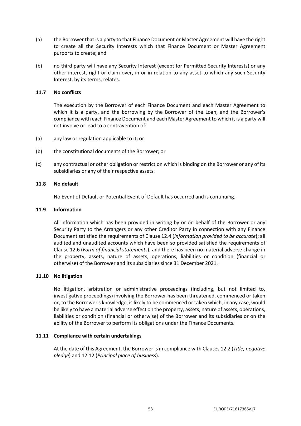 53 EUROPE/71617365v17 (a) the Borrower that is a party to that Finance Document or Master Agreement will have the right to create all the Security Interests which that Finance Document or Master Agreement purports to create; and (b) no third party will have any Security Interest (except for Permitted Security Interests) or any other interest, right or claim over, in or in relation to any asset to which any such Security Interest, by its terms, relates. 11.7 No conflicts The execution by the Borrower of each Finance Document and each Master Agreement to which it is a party, and the borrowing by the Borrower of the Loan, and the Borrower's compliance with each Finance Document and each Master Agreement to which it is a party will not involve or lead to a contravention of: (a) any law or regulation applicable to it; or (b) the constitutional documents of the Borrower; or (c) any contractual or other obligation or restriction which is binding on the Borrower or any of its subsidiaries or any of their respective assets. 11.8 No default No Event of Default or Potential Event of Default has occurred and is continuing. 11.9 Information All information which has been provided in writing by or on behalf of the Borrower or any Security Party to the Arrangers or any other Creditor Party in connection with any Finance Document satisfied the requirements of Clause 12.4 (Information provided to be accurate); all audited and unaudited accounts which have been so provided satisfied the requirements of Clause 12.6 (Form of financial statements); and there has been no material adverse change in the property, assets, nature of assets, operations, liabilities or condition (financial or otherwise) of the Borrower and its subsidiaries since 31 December 2021. 11.10 No litigation No litigation, arbitration or administrative proceedings (including, but not limited to, investigative proceedings) involving the Borrower has been threatened, commenced or taken or, to the Borrower's knowledge, is likely to be commenced or taken which, in any case, would be likely to have a material adverse effect on the property, assets, nature of assets, operations, liabilities or condition (financial or otherwise) of the Borrower and its subsidiaries or on the ability of the Borrower to perform its obligations under the Finance Documents. 11.11 Compliance with certain undertakings At the date of this Agreement, the Borrower is in compliance with Clauses 12.2 (Title; negative pledge) and 12.12 (Principal place of business).