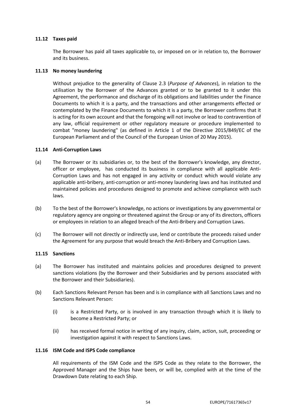 54 EUROPE/71617365v17 11.12 Taxes paid The Borrower has paid all taxes applicable to, or imposed on or in relation to, the Borrower and its business. 11.13 No money laundering Without prejudice to the generality of Clause 2.3 (Purpose of Advances), in relation to the utilisation by the Borrower of the Advances granted or to be granted to it under this Agreement, the performance and discharge of its obligations and liabilities under the Finance Documents to which it is a party, and the transactions and other arrangements effected or contemplated by the Finance Documents to which it is a party, the Borrower confirms that it is acting for its own account and that the foregoing will not involve or lead to contravention of any law, official requirement or other regulatory measure or procedure implemented to combat "money laundering" (as defined in Article 1 of the Directive 2015/849/EC of the European Parliament and of the Council of the European Union of 20 May 2015). 11.14 Anti-Corruption Laws (a) The Borrower or its subsidiaries or, to the best of the Borrower's knowledge, any director, officer or employee, has conducted its business in compliance with all applicable Anti- Corruption Laws and has not engaged in any activity or conduct which would violate any applicable anti-bribery, anti-corruption or anti-money laundering laws and has instituted and maintained policies and procedures designed to promote and achieve compliance with such laws. (b) To the best of the Borrower's knowledge, no actions or investigations by any governmental or regulatory agency are ongoing or threatened against the Group or any of its directors, officers or employees in relation to an alleged breach of the Anti-Bribery and Corruption Laws. (c) The Borrower will not directly or indirectly use, lend or contribute the proceeds raised under the Agreement for any purpose that would breach the Anti-Bribery and Corruption Laws. 11.15 Sanctions (a) The Borrower has instituted and maintains policies and procedures designed to prevent sanctions violations (by the Borrower and their Subsidiaries and by persons associated with the Borrower and their Subsidiaries). (b) Each Sanctions Relevant Person has been and is in compliance with all Sanctions Laws and no Sanctions Relevant Person: (i) is a Restricted Party, or is involved in any transaction through which it is likely to become a Restricted Party; or (ii) has received formal notice in writing of any inquiry, claim, action, suit, proceeding or investigation against it with respect to Sanctions Laws. 11.16 ISM Code and ISPS Code compliance All requirements of the ISM Code and the ISPS Code as they relate to the Borrower, the Approved Manager and the Ships have been, or will be, complied with at the time of the Drawdown Date relating to each Ship.