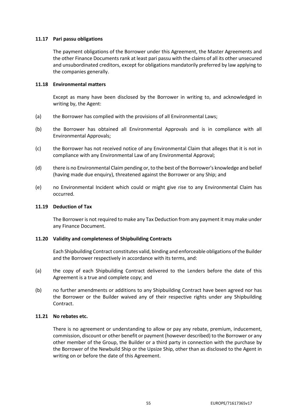 55 EUROPE/71617365v17 11.17 Pari passu obligations The payment obligations of the Borrower under this Agreement, the Master Agreements and the other Finance Documents rank at least pari passu with the claims of all its other unsecured and unsubordinated creditors, except for obligations mandatorily preferred by law applying to the companies generally. 11.18 Environmental matters Except as many have been disclosed by the Borrower in writing to, and acknowledged in writing by, the Agent: (a) the Borrower has complied with the provisions of all Environmental Laws; (b) the Borrower has obtained all Environmental Approvals and is in compliance with all Environmental Approvals; (c) the Borrower has not received notice of any Environmental Claim that alleges that it is not in compliance with any Environmental Law of any Environmental Approval; (d) there is no Environmental Claim pending or, to the best of the Borrower's knowledge and belief (having made due enquiry), threatened against the Borrower or any Ship; and (e) no Environmental Incident which could or might give rise to any Environmental Claim has occurred. 11.19 Deduction of Tax The Borrower is not required to make any Tax Deduction from any payment it may make under any Finance Document. 11.20 Validity and completeness of Shipbuilding Contracts Each Shipbuilding Contract constitutes valid, binding and enforceable obligations of the Builder and the Borrower respectively in accordance with its terms, and: (a) the copy of each Shipbuilding Contract delivered to the Lenders before the date of this Agreement is a true and complete copy; and (b) no further amendments or additions to any Shipbuilding Contract have been agreed nor has the Borrower or the Builder waived any of their respective rights under any Shipbuilding Contract. 11.21 No rebates etc. There is no agreement or understanding to allow or pay any rebate, premium, inducement, commission, discount or other benefit or payment (however described) to the Borrower or any other member of the Group, the Builder or a third party in connection with the purchase by the Borrower of the Newbuild Ship or the Upsize Ship, other than as disclosed to the Agent in writing on or before the date of this Agreement.
