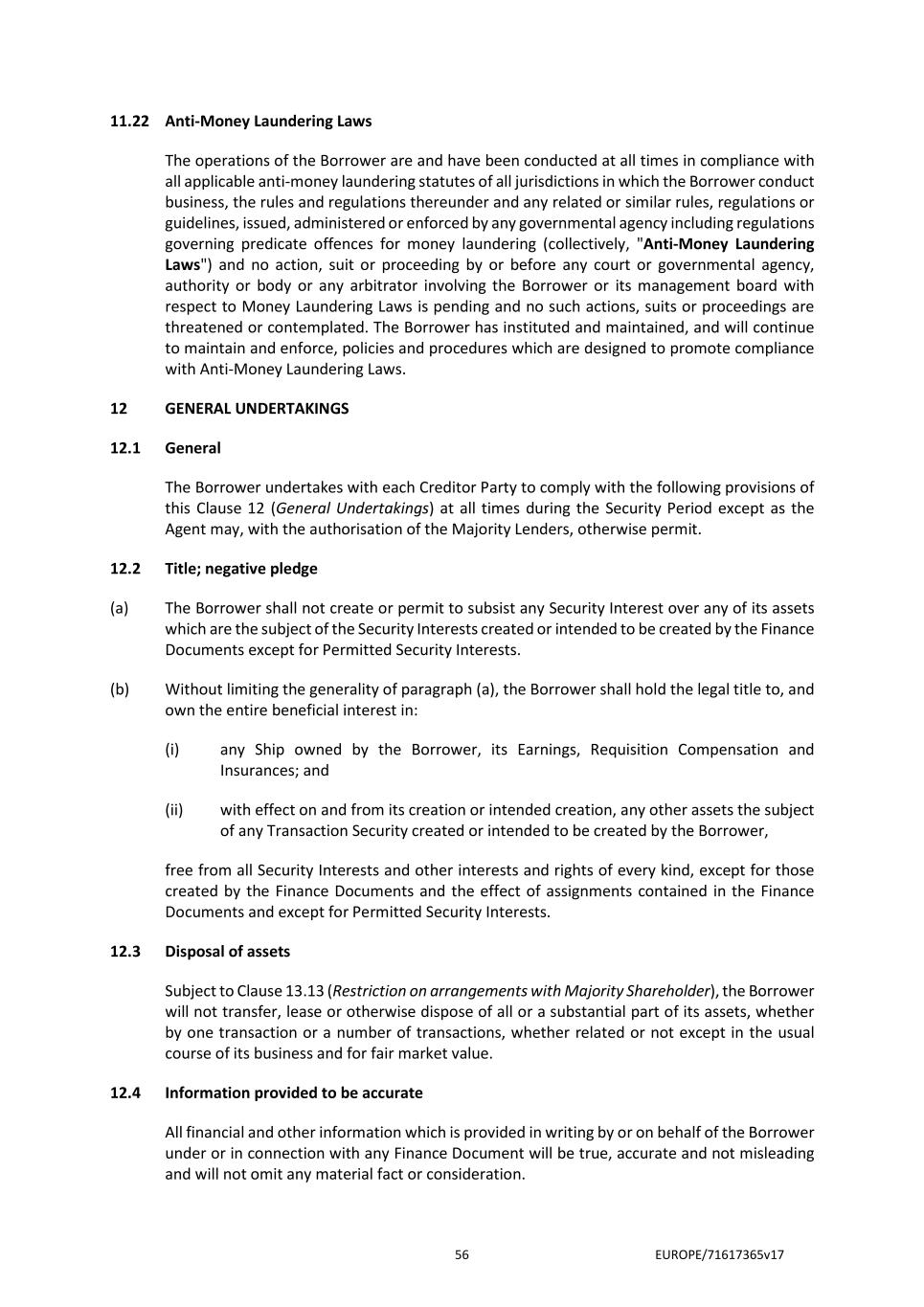 56 EUROPE/71617365v17 11.22 Anti-Money Laundering Laws The operations of the Borrower are and have been conducted at all times in compliance with all applicable anti-money laundering statutes of all jurisdictions in which the Borrower conduct business, the rules and regulations thereunder and any related or similar rules, regulations or guidelines, issued, administered or enforced by any governmental agency including regulations governing predicate offences for money laundering (collectively, "Anti-Money Laundering Laws") and no action, suit or proceeding by or before any court or governmental agency, authority or body or any arbitrator involving the Borrower or its management board with respect to Money Laundering Laws is pending and no such actions, suits or proceedings are threatened or contemplated. The Borrower has instituted and maintained, and will continue to maintain and enforce, policies and procedures which are designed to promote compliance with Anti-Money Laundering Laws. 12 GENERAL UNDERTAKINGS 12.1 General The Borrower undertakes with each Creditor Party to comply with the following provisions of this Clause 12 (General Undertakings) at all times during the Security Period except as the Agent may, with the authorisation of the Majority Lenders, otherwise permit. 12.2 Title; negative pledge (a) The Borrower shall not create or permit to subsist any Security Interest over any of its assets which are the subject of the Security Interests created or intended to be created by the Finance Documents except for Permitted Security Interests. (b) Without limiting the generality of paragraph (a), the Borrower shall hold the legal title to, and own the entire beneficial interest in: (i) any Ship owned by the Borrower, its Earnings, Requisition Compensation and Insurances; and (ii) with effect on and from its creation or intended creation, any other assets the subject of any Transaction Security created or intended to be created by the Borrower, free from all Security Interests and other interests and rights of every kind, except for those created by the Finance Documents and the effect of assignments contained in the Finance Documents and except for Permitted Security Interests. 12.3 Disposal of assets Subject to Clause 13.13 (Restriction on arrangements with Majority Shareholder), the Borrower will not transfer, lease or otherwise dispose of all or a substantial part of its assets, whether by one transaction or a number of transactions, whether related or not except in the usual course of its business and for fair market value. 12.4 Information provided to be accurate All financial and other information which is provided in writing by or on behalf of the Borrower under or in connection with any Finance Document will be true, accurate and not misleading and will not omit any material fact or consideration.