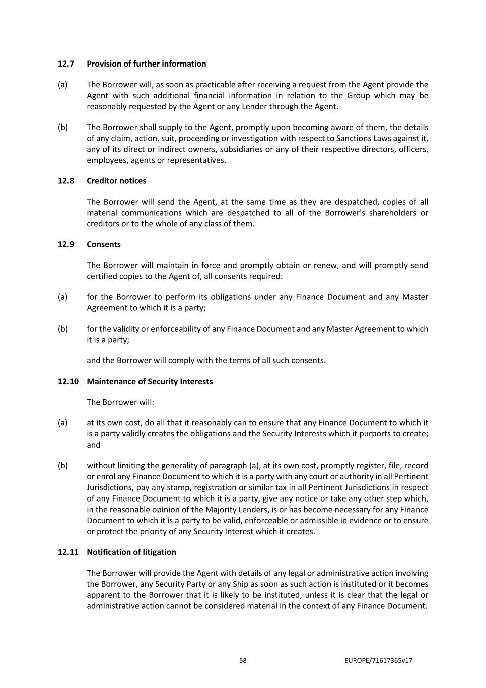 58 EUROPE/71617365v17 12.7 Provision of further information (a) The Borrower will, as soon as practicable after receiving a request from the Agent provide the Agent with such additional financial information in relation to the Group which may be reasonably requested by the Agent or any Lender through the Agent. (b) The Borrower shall supply to the Agent, promptly upon becoming aware of them, the details of any claim, action, suit, proceeding or investigation with respect to Sanctions Laws against it, any of its direct or indirect owners, subsidiaries or any of their respective directors, officers, employees, agents or representatives. 12.8 Creditor notices The Borrower will send the Agent, at the same time as they are despatched, copies of all material communications which are despatched to all of the Borrower's shareholders or creditors or to the whole of any class of them. 12.9 Consents The Borrower will maintain in force and promptly obtain or renew, and will promptly send certified copies to the Agent of, all consents required: (a) for the Borrower to perform its obligations under any Finance Document and any Master Agreement to which it is a party; (b) for the validity or enforceability of any Finance Document and any Master Agreement to which it is a party; and the Borrower will comply with the terms of all such consents. 12.10 Maintenance of Security Interests The Borrower will: (a) at its own cost, do all that it reasonably can to ensure that any Finance Document to which it is a party validly creates the obligations and the Security Interests which it purports to create; and (b) without limiting the generality of paragraph (a), at its own cost, promptly register, file, record or enrol any Finance Document to which it is a party with any court or authority in all Pertinent Jurisdictions, pay any stamp, registration or similar tax in all Pertinent Jurisdictions in respect of any Finance Document to which it is a party, give any notice or take any other step which, in the reasonable opinion of the Majority Lenders, is or has become necessary for any Finance Document to which it is a party to be valid, enforceable or admissible in evidence or to ensure or protect the priority of any Security Interest which it creates. 12.11 Notification of litigation The Borrower will provide the Agent with details of any legal or administrative action involving the Borrower, any Security Party or any Ship as soon as such action is instituted or it becomes apparent to the Borrower that it is likely to be instituted, unless it is clear that the legal or administrative action cannot be considered material in the context of any Finance Document.