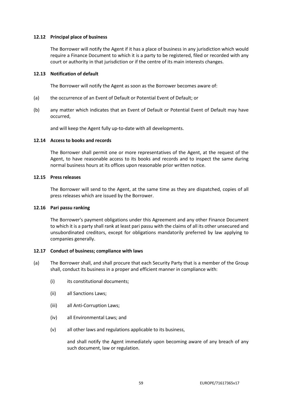 59 EUROPE/71617365v17 12.12 Principal place of business The Borrower will notify the Agent if it has a place of business in any jurisdiction which would require a Finance Document to which it is a party to be registered, filed or recorded with any court or authority in that jurisdiction or if the centre of its main interests changes. 12.13 Notification of default The Borrower will notify the Agent as soon as the Borrower becomes aware of: (a) the occurrence of an Event of Default or Potential Event of Default; or (b) any matter which indicates that an Event of Default or Potential Event of Default may have occurred, and will keep the Agent fully up-to-date with all developments. 12.14 Access to books and records The Borrower shall permit one or more representatives of the Agent, at the request of the Agent, to have reasonable access to its books and records and to inspect the same during normal business hours at its offices upon reasonable prior written notice. 12.15 Press releases The Borrower will send to the Agent, at the same time as they are dispatched, copies of all press releases which are issued by the Borrower. 12.16 Pari passu ranking The Borrower's payment obligations under this Agreement and any other Finance Document to which it is a party shall rank at least pari passu with the claims of all its other unsecured and unsubordinated creditors, except for obligations mandatorily preferred by law applying to companies generally. 12.17 Conduct of business; compliance with laws (a) The Borrower shall, and shall procure that each Security Party that is a member of the Group shall, conduct its business in a proper and efficient manner in compliance with: (i) its constitutional documents; (ii) all Sanctions Laws; (iii) all Anti-Corruption Laws; (iv) all Environmental Laws; and (v) all other laws and regulations applicable to its business, and shall notify the Agent immediately upon becoming aware of any breach of any such document, law or regulation.