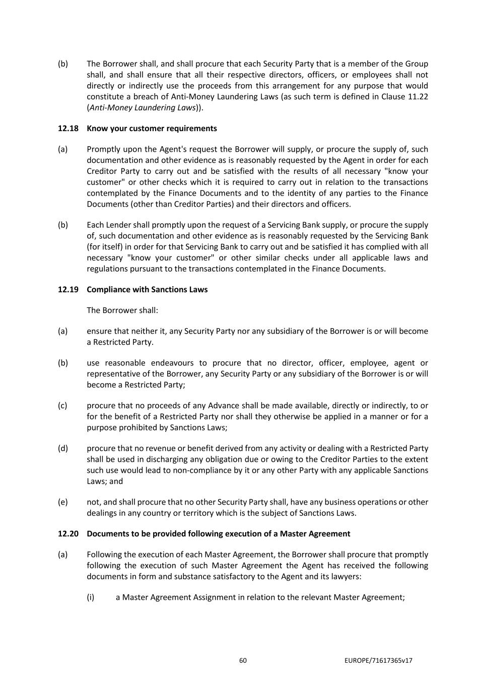 60 EUROPE/71617365v17 (b) The Borrower shall, and shall procure that each Security Party that is a member of the Group shall, and shall ensure that all their respective directors, officers, or employees shall not directly or indirectly use the proceeds from this arrangement for any purpose that would constitute a breach of Anti-Money Laundering Laws (as such term is defined in Clause 11.22 (Anti-Money Laundering Laws)). 12.18 Know your customer requirements (a) Promptly upon the Agent's request the Borrower will supply, or procure the supply of, such documentation and other evidence as is reasonably requested by the Agent in order for each Creditor Party to carry out and be satisfied with the results of all necessary "know your customer" or other checks which it is required to carry out in relation to the transactions contemplated by the Finance Documents and to the identity of any parties to the Finance Documents (other than Creditor Parties) and their directors and officers. (b) Each Lender shall promptly upon the request of a Servicing Bank supply, or procure the supply of, such documentation and other evidence as is reasonably requested by the Servicing Bank (for itself) in order for that Servicing Bank to carry out and be satisfied it has complied with all necessary "know your customer" or other similar checks under all applicable laws and regulations pursuant to the transactions contemplated in the Finance Documents. 12.19 Compliance with Sanctions Laws The Borrower shall: (a) ensure that neither it, any Security Party nor any subsidiary of the Borrower is or will become a Restricted Party. (b) use reasonable endeavours to procure that no director, officer, employee, agent or representative of the Borrower, any Security Party or any subsidiary of the Borrower is or will become a Restricted Party; (c) procure that no proceeds of any Advance shall be made available, directly or indirectly, to or for the benefit of a Restricted Party nor shall they otherwise be applied in a manner or for a purpose prohibited by Sanctions Laws; (d) procure that no revenue or benefit derived from any activity or dealing with a Restricted Party shall be used in discharging any obligation due or owing to the Creditor Parties to the extent such use would lead to non-compliance by it or any other Party with any applicable Sanctions Laws; and (e) not, and shall procure that no other Security Party shall, have any business operations or other dealings in any country or territory which is the subject of Sanctions Laws. 12.20 Documents to be provided following execution of a Master Agreement (a) Following the execution of each Master Agreement, the Borrower shall procure that promptly following the execution of such Master Agreement the Agent has received the following documents in form and substance satisfactory to the Agent and its lawyers: (i) a Master Agreement Assignment in relation to the relevant Master Agreement;