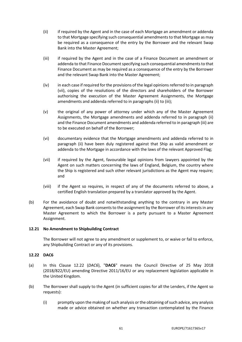 61 EUROPE/71617365v17 (ii) if required by the Agent and in the case of each Mortgage an amendment or addenda to that Mortgage specifying such consequential amendments to that Mortgage as may be required as a consequence of the entry by the Borrower and the relevant Swap Bank into the Master Agreement; (iii) if required by the Agent and in the case of a Finance Document an amendment or addenda to that Finance Document specifying such consequential amendments to that Finance Document as may be required as a consequence of the entry by the Borrower and the relevant Swap Bank into the Master Agreement; (iv) in each case if required for the provisions of the legal opinions referred to in paragraph (vii), copies of the resolutions of the directors and shareholders of the Borrower authorising the execution of the Master Agreement Assignments, the Mortgage amendments and addenda referred to in paragraphs (ii) to (iii); (v) the original of any power of attorney under which any of the Master Agreement Assignments, the Mortgage amendments and addenda referred to in paragraph (ii) and the Finance Document amendments and addenda referred to in paragraph (iii) are to be executed on behalf of the Borrower; (vi) documentary evidence that the Mortgage amendments and addenda referred to in paragraph (ii) have been duly registered against that Ship as valid amendment or addenda to the Mortgage in accordance with the laws of the relevant Approved Flag; (vii) if required by the Agent, favourable legal opinions from lawyers appointed by the Agent on such matters concerning the laws of England, Belgium, the country where the Ship is registered and such other relevant jurisdictions as the Agent may require; and (viii) if the Agent so requires, in respect of any of the documents referred to above, a certified English translation prepared by a translator approved by the Agent. (b) For the avoidance of doubt and notwithstanding anything to the contrary in any Master Agreement, each Swap Bank consents to the assignment by the Borrower of its interests in any Master Agreement to which the Borrower is a party pursuant to a Master Agreement Assignment. 12.21 No Amendment to Shipbuilding Contract The Borrower will not agree to any amendment or supplement to, or waive or fail to enforce, any Shipbuilding Contract or any of its provisions. 12.22 DAC6 (a) In this Clause 12.22 (DAC6), "DAC6" means the Council Directive of 25 May 2018 (2018/822/EU) amending Directive 2011/16/EU or any replacement legislation applicable in the United Kingdom. (b) The Borrower shall supply to the Agent (in sufficient copies for all the Lenders, if the Agent so requests): (i) promptly upon the making of such analysis or the obtaining of such advice, any analysis made or advice obtained on whether any transaction contemplated by the Finance