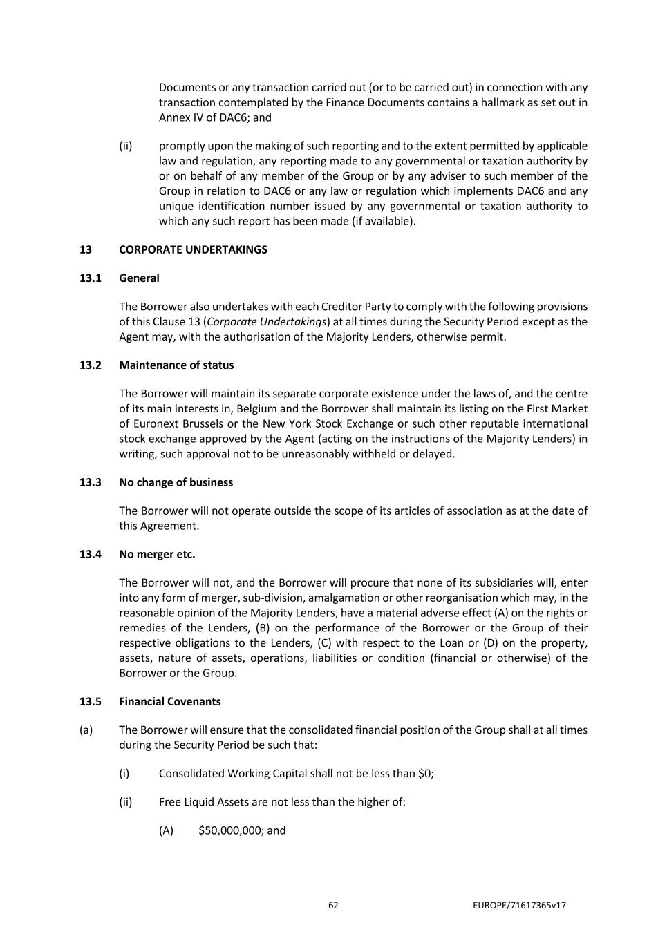 62 EUROPE/71617365v17 Documents or any transaction carried out (or to be carried out) in connection with any transaction contemplated by the Finance Documents contains a hallmark as set out in Annex IV of DAC6; and (ii) promptly upon the making of such reporting and to the extent permitted by applicable law and regulation, any reporting made to any governmental or taxation authority by or on behalf of any member of the Group or by any adviser to such member of the Group in relation to DAC6 or any law or regulation which implements DAC6 and any unique identification number issued by any governmental or taxation authority to which any such report has been made (if available). 13 CORPORATE UNDERTAKINGS 13.1 General The Borrower also undertakes with each Creditor Party to comply with the following provisions of this Clause 13 (Corporate Undertakings) at all times during the Security Period except as the Agent may, with the authorisation of the Majority Lenders, otherwise permit. 13.2 Maintenance of status The Borrower will maintain its separate corporate existence under the laws of, and the centre of its main interests in, Belgium and the Borrower shall maintain its listing on the First Market of Euronext Brussels or the New York Stock Exchange or such other reputable international stock exchange approved by the Agent (acting on the instructions of the Majority Lenders) in writing, such approval not to be unreasonably withheld or delayed. 13.3 No change of business The Borrower will not operate outside the scope of its articles of association as at the date of this Agreement. 13.4 No merger etc. The Borrower will not, and the Borrower will procure that none of its subsidiaries will, enter into any form of merger, sub-division, amalgamation or other reorganisation which may, in the reasonable opinion of the Majority Lenders, have a material adverse effect (A) on the rights or remedies of the Lenders, (B) on the performance of the Borrower or the Group of their respective obligations to the Lenders, (C) with respect to the Loan or (D) on the property, assets, nature of assets, operations, liabilities or condition (financial or otherwise) of the Borrower or the Group. 13.5 Financial Covenants (a) The Borrower will ensure that the consolidated financial position of the Group shall at all times during the Security Period be such that: (i) Consolidated Working Capital shall not be less than $0; (ii) Free Liquid Assets are not less than the higher of: (A) $50,000,000; and
