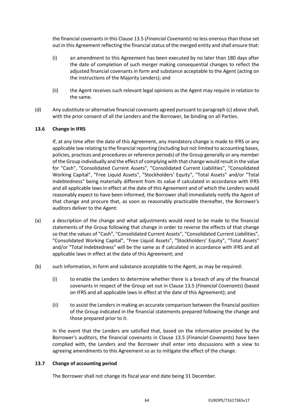 64 EUROPE/71617365v17 the financial covenants in this Clause 13.5 (Financial Covenants) no less onerous than those set out in this Agreement reflecting the financial status of the merged entity and shall ensure that: (i) an amendment to this Agreement has been executed by no later than 180 days after the date of completion of such merger making consequential changes to reflect the adjusted financial covenants in form and substance acceptable to the Agent (acting on the instructions of the Majority Lenders); and (ii) the Agent receives such relevant legal opinions as the Agent may require in relation to the same. (d) Any substitute or alternative financial covenants agreed pursuant to paragraph (c) above shall, with the prior consent of all the Lenders and the Borrower, be binding on all Parties. 13.6 Change in IFRS If, at any time after the date of this Agreement, any mandatory change is made to IFRS or any applicable law relating to the financial reporting (including but not limited to accounting bases, policies, practices and procedures or reference periods) of the Group generally or any member of the Group individually and the effect of complying with that change would result in the value for "Cash", "Consolidated Current Assets", "Consolidated Current Liabilities", "Consolidated Working Capital", "Free Liquid Assets", "Stockholders' Equity", "Total Assets" and/or "Total Indebtedness" being materially different from its value if calculated in accordance with IFRS and all applicable laws in effect at the date of this Agreement and of which the Lenders would reasonably expect to have been informed, the Borrower shall immediately notify the Agent of that change and procure that, as soon as reasonably practicable thereafter, the Borrower's auditors deliver to the Agent: (a) a description of the change and what adjustments would need to be made to the financial statements of the Group following that change in order to reverse the effects of that change so that the values of "Cash", "Consolidated Current Assets", "Consolidated Current Liabilities", "Consolidated Working Capital", "Free Liquid Assets", "Stockholders' Equity", "Total Assets" and/or "Total Indebtedness" will be the same as if calculated in accordance with IFRS and all applicable laws in effect at the date of this Agreement; and (b) such information, in form and substance acceptable to the Agent, as may be required: (i) to enable the Lenders to determine whether there is a breach of any of the financial covenants in respect of the Group set out in Clause 13.5 (Financial Covenants) (based on IFRS and all applicable laws in effect at the date of this Agreement); and (ii) to assist the Lenders in making an accurate comparison between the financial position of the Group indicated in the financial statements prepared following the change and those prepared prior to it. In the event that the Lenders are satisfied that, based on the information provided by the Borrower's auditors, the financial covenants in Clause 13.5 (Financial Covenants) have been complied with, the Lenders and the Borrower shall enter into discussions with a view to agreeing amendments to this Agreement so as to mitigate the effect of the change. 13.7 Change of accounting period The Borrower shall not change its fiscal year end date being 31 December.