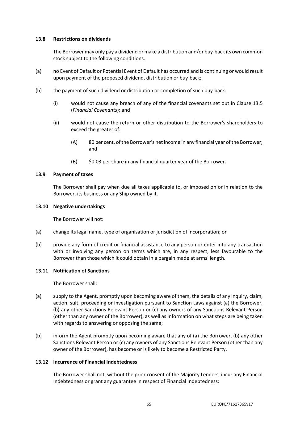 65 EUROPE/71617365v17 13.8 Restrictions on dividends The Borrower may only pay a dividend or make a distribution and/or buy-back its own common stock subject to the following conditions: (a) no Event of Default or Potential Event of Default has occurred and is continuing or would result upon payment of the proposed dividend, distribution or buy-back; (b) the payment of such dividend or distribution or completion of such buy-back: (i) would not cause any breach of any of the financial covenants set out in Clause 13.5 (Financial Covenants); and (ii) would not cause the return or other distribution to the Borrower's shareholders to exceed the greater of: (A) 80 per cent. of the Borrower's net income in any financial year of the Borrower; and (B) $0.03 per share in any financial quarter year of the Borrower. 13.9 Payment of taxes The Borrower shall pay when due all taxes applicable to, or imposed on or in relation to the Borrower, its business or any Ship owned by it. 13.10 Negative undertakings The Borrower will not: (a) change its legal name, type of organisation or jurisdiction of incorporation; or (b) provide any form of credit or financial assistance to any person or enter into any transaction with or involving any person on terms which are, in any respect, less favourable to the Borrower than those which it could obtain in a bargain made at arms' length. 13.11 Notification of Sanctions The Borrower shall: (a) supply to the Agent, promptly upon becoming aware of them, the details of any inquiry, claim, action, suit, proceeding or investigation pursuant to Sanction Laws against (a) the Borrower, (b) any other Sanctions Relevant Person or (c) any owners of any Sanctions Relevant Person (other than any owner of the Borrower), as well as information on what steps are being taken with regards to answering or opposing the same; (b) inform the Agent promptly upon becoming aware that any of (a) the Borrower, (b) any other Sanctions Relevant Person or (c) any owners of any Sanctions Relevant Person (other than any owner of the Borrower), has become or is likely to become a Restricted Party. 13.12 Incurrence of Financial Indebtedness The Borrower shall not, without the prior consent of the Majority Lenders, incur any Financial Indebtedness or grant any guarantee in respect of Financial Indebtedness: