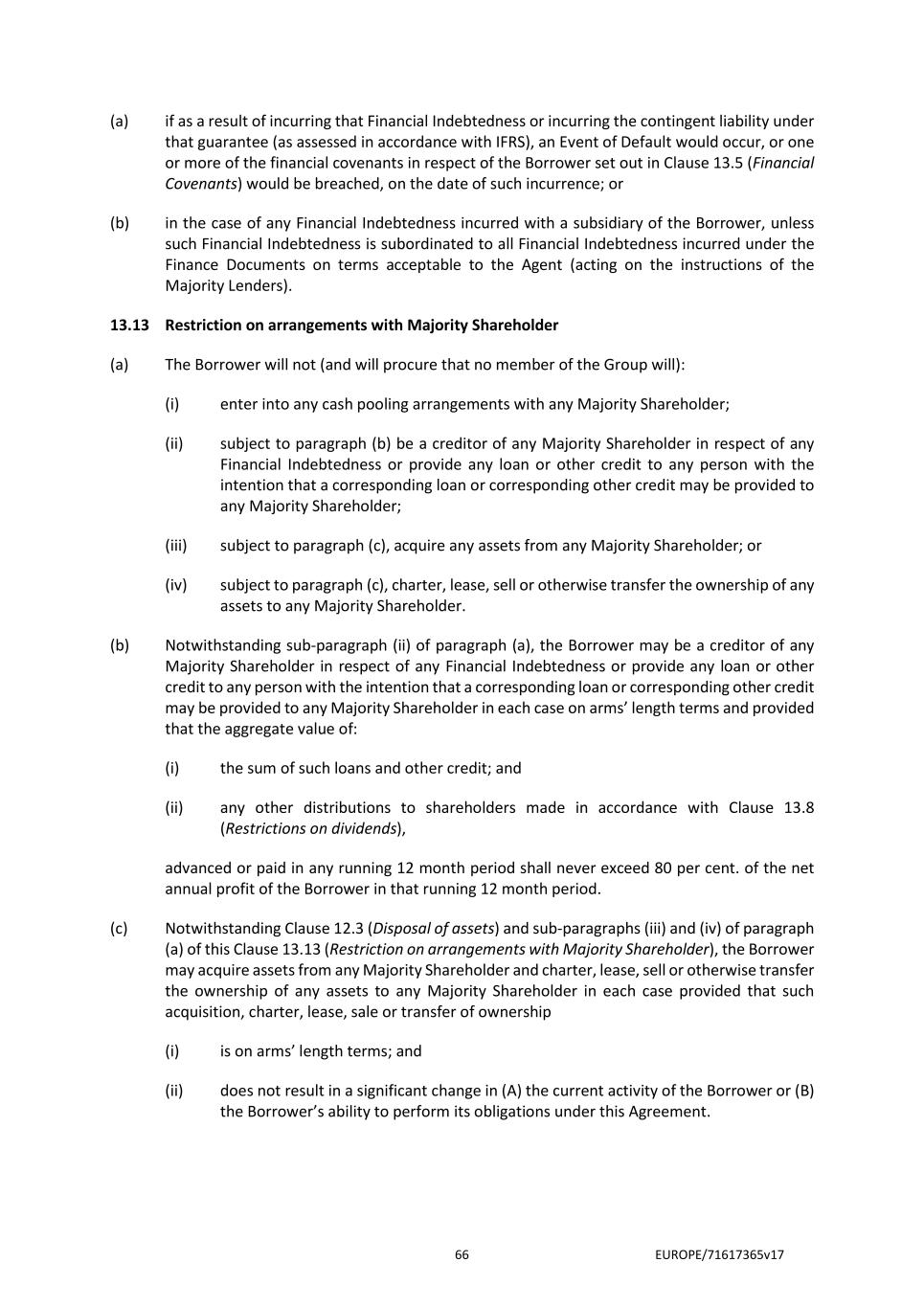 66 EUROPE/71617365v17 (a) if as a result of incurring that Financial Indebtedness or incurring the contingent liability under that guarantee (as assessed in accordance with IFRS), an Event of Default would occur, or one or more of the financial covenants in respect of the Borrower set out in Clause 13.5 (Financial Covenants) would be breached, on the date of such incurrence; or (b) in the case of any Financial Indebtedness incurred with a subsidiary of the Borrower, unless such Financial Indebtedness is subordinated to all Financial Indebtedness incurred under the Finance Documents on terms acceptable to the Agent (acting on the instructions of the Majority Lenders). 13.13 Restriction on arrangements with Majority Shareholder (a) The Borrower will not (and will procure that no member of the Group will): (i) enter into any cash pooling arrangements with any Majority Shareholder; (ii) subject to paragraph (b) be a creditor of any Majority Shareholder in respect of any Financial Indebtedness or provide any loan or other credit to any person with the intention that a corresponding loan or corresponding other credit may be provided to any Majority Shareholder; (iii) subject to paragraph (c), acquire any assets from any Majority Shareholder; or (iv) subject to paragraph (c), charter, lease, sell or otherwise transfer the ownership of any assets to any Majority Shareholder. (b) Notwithstanding sub-paragraph (ii) of paragraph (a), the Borrower may be a creditor of any Majority Shareholder in respect of any Financial Indebtedness or provide any loan or other credit to any person with the intention that a corresponding loan or corresponding other credit may be provided to any Majority Shareholder in each case on arms’ length terms and provided that the aggregate value of: (i) the sum of such loans and other credit; and (ii) any other distributions to shareholders made in accordance with Clause 13.8 (Restrictions on dividends), advanced or paid in any running 12 month period shall never exceed 80 per cent. of the net annual profit of the Borrower in that running 12 month period. (c) Notwithstanding Clause 12.3 (Disposal of assets) and sub-paragraphs (iii) and (iv) of paragraph (a) of this Clause 13.13 (Restriction on arrangements with Majority Shareholder), the Borrower may acquire assets from any Majority Shareholder and charter, lease, sell or otherwise transfer the ownership of any assets to any Majority Shareholder in each case provided that such acquisition, charter, lease, sale or transfer of ownership (i) is on arms’ length terms; and (ii) does not result in a significant change in (A) the current activity of the Borrower or (B) the Borrower’s ability to perform its obligations under this Agreement.