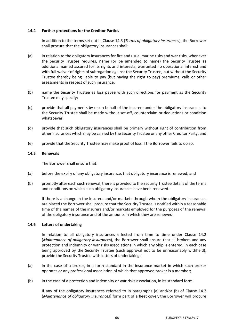 68 EUROPE/71617365v17 14.4 Further protections for the Creditor Parties In addition to the terms set out in Clause 14.3 (Terms of obligatory insurances), the Borrower shall procure that the obligatory insurances shall: (a) in relation to the obligatory insurances for fire and usual marine risks and war risks, whenever the Security Trustee requires, name (or be amended to name) the Security Trustee as additional named assured for its rights and interests, warranted no operational interest and with full waiver of rights of subrogation against the Security Trustee, but without the Security Trustee thereby being liable to pay (but having the right to pay) premiums, calls or other assessments in respect of such insurance; (b) name the Security Trustee as loss payee with such directions for payment as the Security Trustee may specify; (c) provide that all payments by or on behalf of the insurers under the obligatory insurances to the Security Trustee shall be made without set-off, counterclaim or deductions or condition whatsoever; (d) provide that such obligatory insurances shall be primary without right of contribution from other insurances which may be carried by the Security Trustee or any other Creditor Party; and (e) provide that the Security Trustee may make proof of loss if the Borrower fails to do so. 14.5 Renewals The Borrower shall ensure that: (a) before the expiry of any obligatory insurance, that obligatory insurance is renewed; and (b) promptly after each such renewal, there is provided to the Security Trustee details of the terms and conditions on which such obligatory insurances have been renewed. If there is a change in the insurers and/or markets through whom the obligatory insurances are placed the Borrower shall procure that the Security Trustee is notified within a reasonable time of the names of the insurers and/or markets employed for the purposes of the renewal of the obligatory insurance and of the amounts in which they are renewed. 14.6 Letters of undertaking In relation to all obligatory insurances effected from time to time under Clause 14.2 (Maintenance of obligatory insurances), the Borrower shall ensure that all brokers and any protection and indemnity or war risks associations in which any Ship is entered, in each case being approved by the Security Trustee (such approval not to be unreasonably withheld), provide the Security Trustee with letters of undertaking: (a) in the case of a broker, in a form standard in the insurance market in which such broker operates or any professional association of which that approved broker is a member; (b) in the case of a protection and indemnity or war risks association, in its standard form. If any of the obligatory insurances referred to in paragraphs (a) and/or (b) of Clause 14.2 (Maintenance of obligatory insurances) form part of a fleet cover, the Borrower will procure