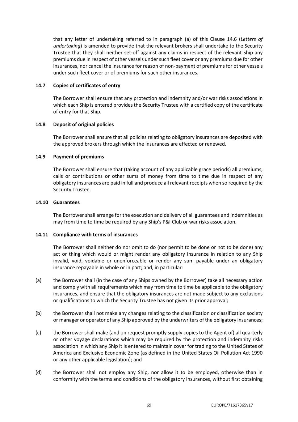 69 EUROPE/71617365v17 that any letter of undertaking referred to in paragraph (a) of this Clause 14.6 (Letters of undertaking) is amended to provide that the relevant brokers shall undertake to the Security Trustee that they shall neither set-off against any claims in respect of the relevant Ship any premiums due in respect of other vessels under such fleet cover or any premiums due for other insurances, nor cancel the insurance for reason of non-payment of premiums for other vessels under such fleet cover or of premiums for such other insurances. 14.7 Copies of certificates of entry The Borrower shall ensure that any protection and indemnity and/or war risks associations in which each Ship is entered provides the Security Trustee with a certified copy of the certificate of entry for that Ship. 14.8 Deposit of original policies The Borrower shall ensure that all policies relating to obligatory insurances are deposited with the approved brokers through which the insurances are effected or renewed. 14.9 Payment of premiums The Borrower shall ensure that (taking account of any applicable grace periods) all premiums, calls or contributions or other sums of money from time to time due in respect of any obligatory insurances are paid in full and produce all relevant receipts when so required by the Security Trustee. 14.10 Guarantees The Borrower shall arrange for the execution and delivery of all guarantees and indemnities as may from time to time be required by any Ship's P&I Club or war risks association. 14.11 Compliance with terms of insurances The Borrower shall neither do nor omit to do (nor permit to be done or not to be done) any act or thing which would or might render any obligatory insurance in relation to any Ship invalid, void, voidable or unenforceable or render any sum payable under an obligatory insurance repayable in whole or in part; and, in particular: (a) the Borrower shall (in the case of any Ships owned by the Borrower) take all necessary action and comply with all requirements which may from time to time be applicable to the obligatory insurances, and ensure that the obligatory insurances are not made subject to any exclusions or qualifications to which the Security Trustee has not given its prior approval; (b) the Borrower shall not make any changes relating to the classification or classification society or manager or operator of any Ship approved by the underwriters of the obligatory insurances; (c) the Borrower shall make (and on request promptly supply copies to the Agent of) all quarterly or other voyage declarations which may be required by the protection and indemnity risks association in which any Ship it is entered to maintain cover for trading to the United States of America and Exclusive Economic Zone (as defined in the United States Oil Pollution Act 1990 or any other applicable legislation); and (d) the Borrower shall not employ any Ship, nor allow it to be employed, otherwise than in conformity with the terms and conditions of the obligatory insurances, without first obtaining